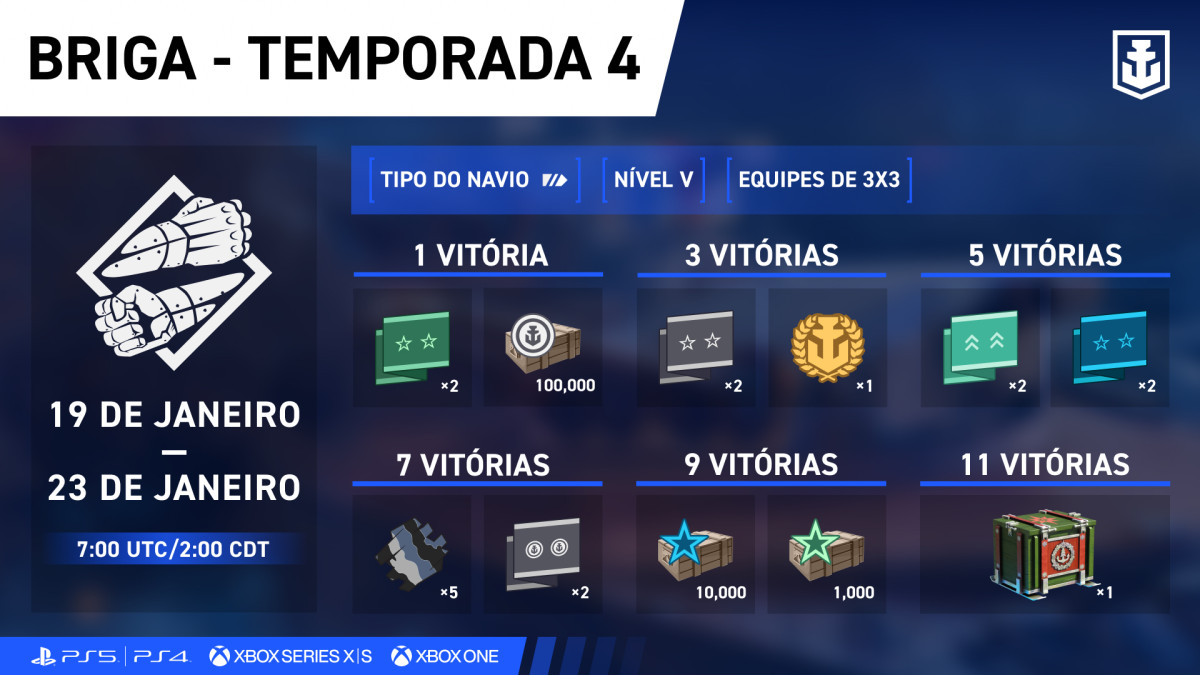 As Brigas estão de volta com força total! Duas temporadas estão disponíveis nesta atualização, dando a você muito tempo para participar, ganhar prêmios e se divertir com seus encouraçados ou cruzadores. Como as Brigas funcionam: este modo de jogo aceita diversos ajustes e algumas extravagâncias para tornar a jogabilidade o mais variada e inusitada possível. Sinta-se à vontade para nos enviar seus comentários e também suas ideias mais loucas sobre possíveis cenários de Brigas. Para isso, entre em contato conosco pelo Discord ou por qualquer outro meio que preferir.