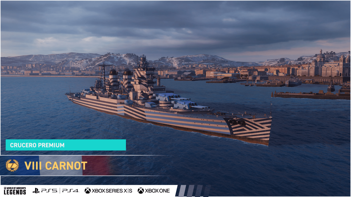 ¿Recuerdan la comodidad infantil y la satisfacción que puede traer el olor de un auto nuevo? ¿O cómo se siente abrir un artículo especial que han estado esperando por mucho tiempo? ¿El placer culpable de agregar otro juguete a su colección secreta? Sabemos que no pueden tocar físicamente al Carnot, y tampoco pueden olerlo o ponerlo en su estante, pero agregarlo a su Puerto podría brindarles alguna idea de las sensaciones anteriores. Este supercrucero pesado, desenfrenado, temerario y de alto octanaje, tiene un gran poder con sus diez cañones de 12 pulgadas (305 mm) que dejará a algunos Capitanes de acorazados verdes de envidia. Pero sus grandes cañones y contundentes proyectiles no solo son lo único que el Carnot puede aportar a su refinada colección: una velocidad extrema, un gran blindaje (¡caparazón de tortuga!) y maniobrabilidad también se encuentran entre sus aspectos más destacados. Por lo tanto, no solo pulverizarán a sus enemigos salva tras salva, sino que también se burlarán de ellos al dictar el alcance, el tiempo y la posición de cada enfrentamiento, al mismo tiempo que ignoran los impactos si conservan una orientación inteligente. Sin embargo, la ocultación no está en el menú. Para aquellos que conocen las habilidades que los Comandantes franceses pueden ofrecer en World of Warships: Legends, si no están entusiasmados con esto, ¡estamos haciendo algo mal!
