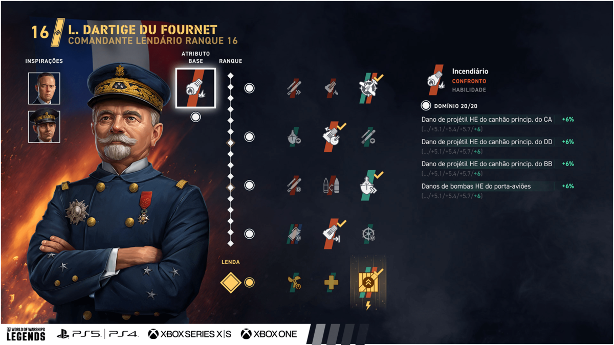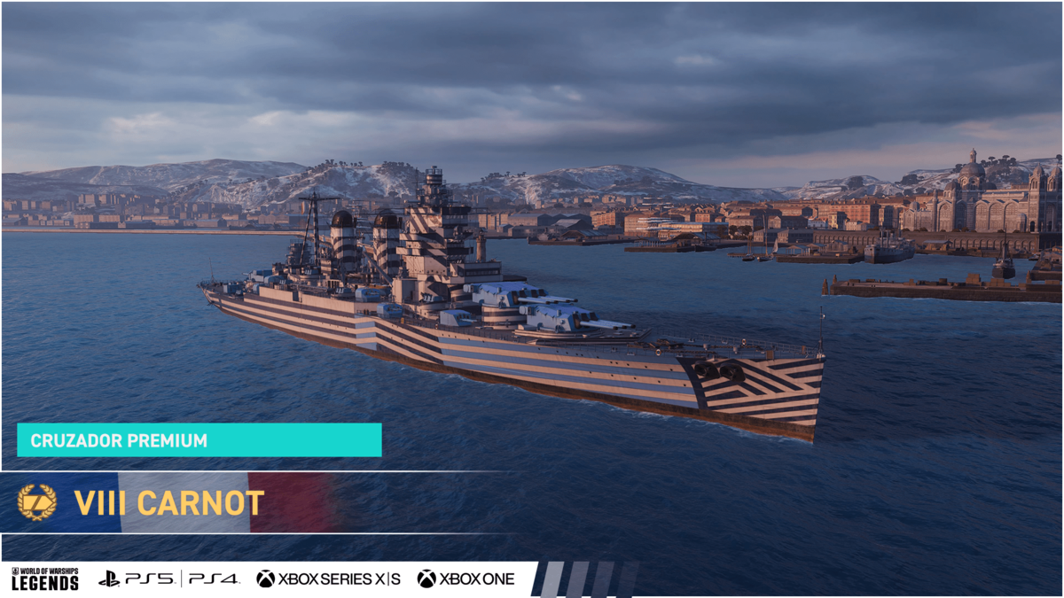 Sabe aquela sensação de conforto e satisfação que só o cheirinho de carro novo tem? A ansiedade de desempacotar uma encomenda que você esperou por muito tempo? O prazer de adicionar mais um brinquedo à coleção secreta? Sabemos que você não pode tocar, nem cheirar ou colocar o Carnot em sua prateleira, mas adicioná-lo ao seu Porto pode muito bem trazer lembranças desses pequenos momentos de felicidade. Armado com dez canhões de 12 polegadas (305 mm), este supercruzador pesado e rápido é tão poderoso que alguns Comandantes de encouraçados vão ficar se mordendo de inveja. Mas artilharia pesada e projéteis de alto impacto não são os únicos pontos fortes do Carnot: velocidade extrema, ótima blindagem (tipo casco de tartaruga) e boa manobrabilidade também estão entre suas muitas qualidades. Assim, você não apenas pulverizará seus inimigos salva após salva, como também os dominará controlando a distância, o local e o momento de cada confronto, ao mesmo tempo em que ignora os poucos ataques recebidos se conseguir se manter orientado corretamente. No entanto, a ocultação não está entre suas vantagens. Se você conhece as habilidades dos Comandantes franceses de World of Warships: Legends, com certeza não ficará indiferente a este navio!