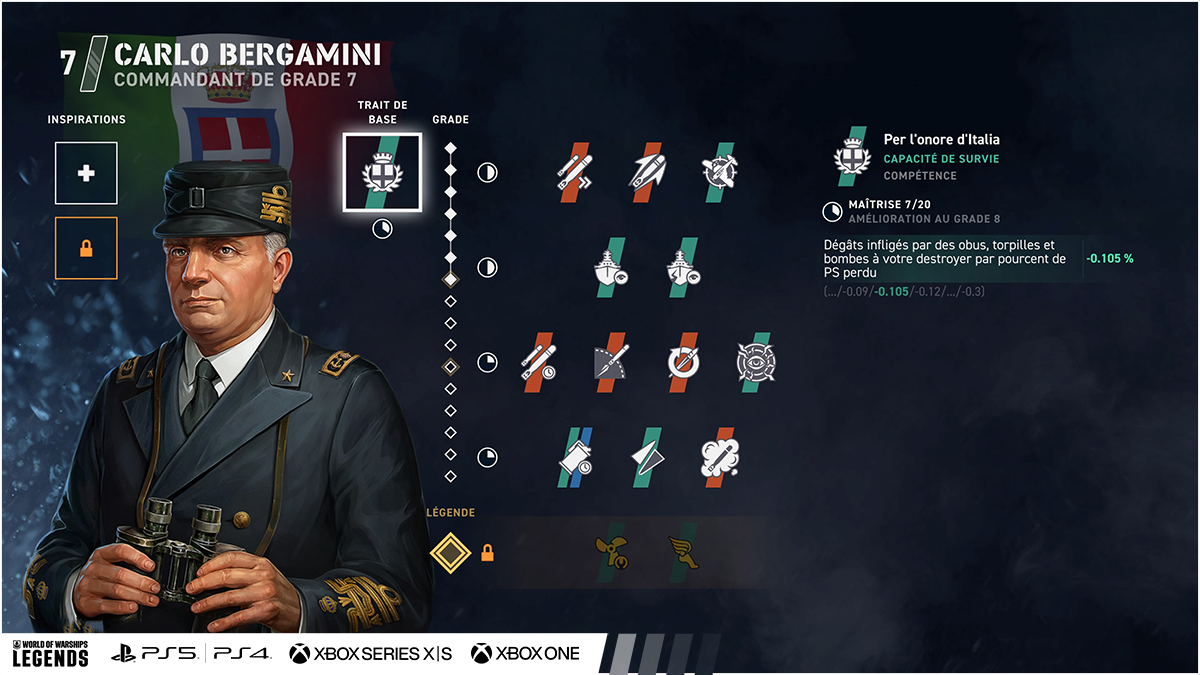 Nouveau commandant de destroyer italien Carlo Bergamini, déjà promu au grade 7 ! C'est le seul moyen de se le procurer durant cette mise à jour. Voici son trait de base et sa compétence unique :