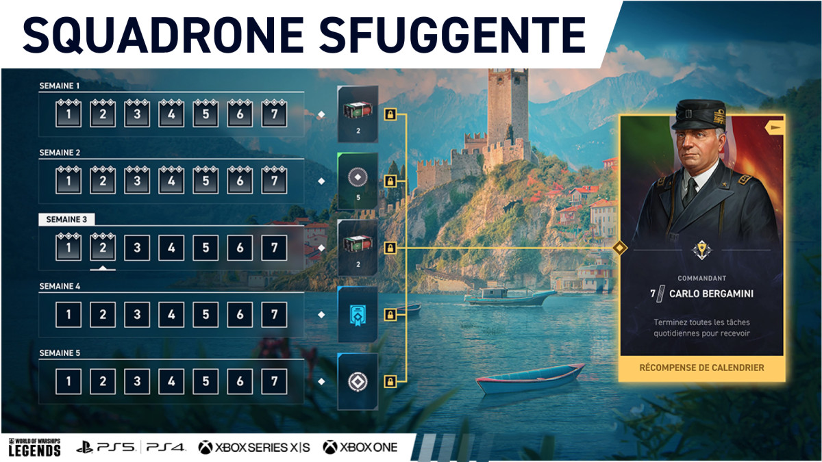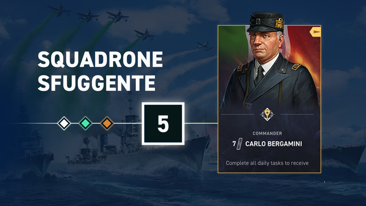Le principe de Squadrone Sfuggente est assez simple : vous recevrez chaque jour trois tâches à accomplir pendant 5 semaines, et vous recevrez des récompenses après avoir rempli toutes les tâches d'une journée ET toutes celles d'une semaine (ce qui donne un total de cinq récompenses hebdomadaires). Terminer toutes les tâches proposées durant ces 5 semaines vous octroiera le premier prix : l'inédit commandant de destroyer italien Carlo Bergamini, déjà promu au grade 7 ! Ce n'est pas grave de rater quelques jours ; vous pouvez les rattraper en dépensant 100 doublons par jour manqué.