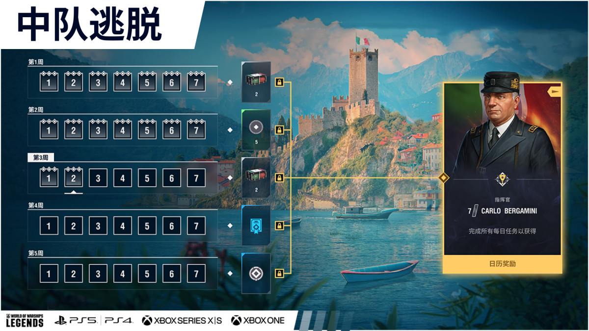 中队逃脱是持续5周的免费日历活动,通过完成任务领取每日奖励和每周奖励,大奖是全新意大利驱逐舰指挥官Carlo Bergamini(已晋升至军衔7)!如果您不小心错过了任务,也无需担心!您可以恢复这些天的任务。不过,恢复某天后您仍然需要完成错过的任务。恢复1天只需要花费100达布隆。