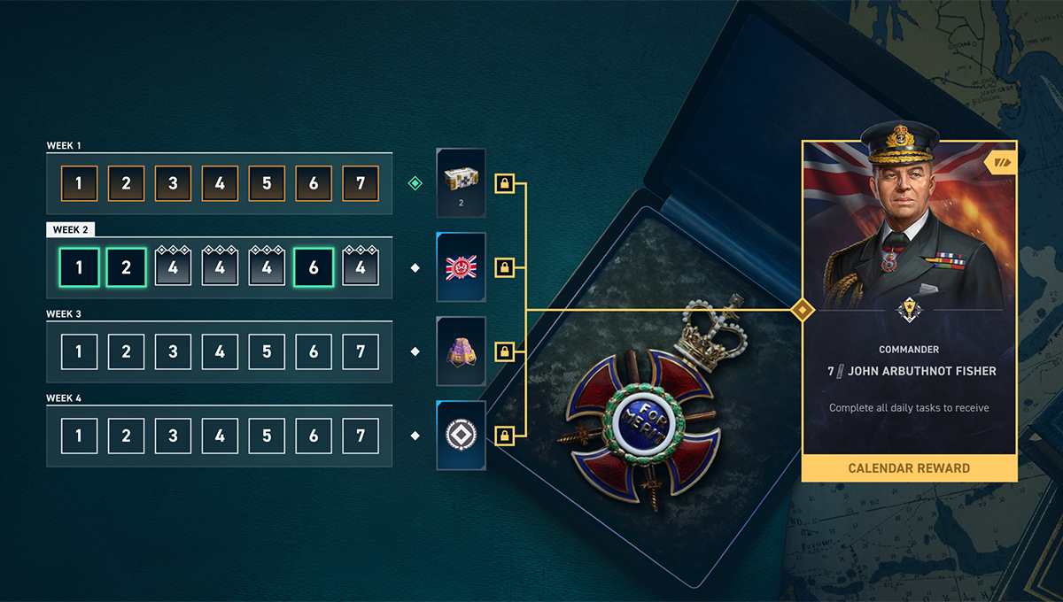 皇家职责日历的规则很简单:您在4周内每天将获得3个可完成的任务,完成每个每日任务后发放奖励,连续完成每日任务可获得每周奖励(总计4个每周奖励)。完成4周内的所有任务您将获得最终奖励——全新英国战列舰指挥官John Fisher,他是专为指挥抢先体验的新分支战列舰设计的指挥官。此外,他已经升至军衔7!John Fisher目标专属于日历,但在日后的版本中将加入商店和英国指挥官箱子。