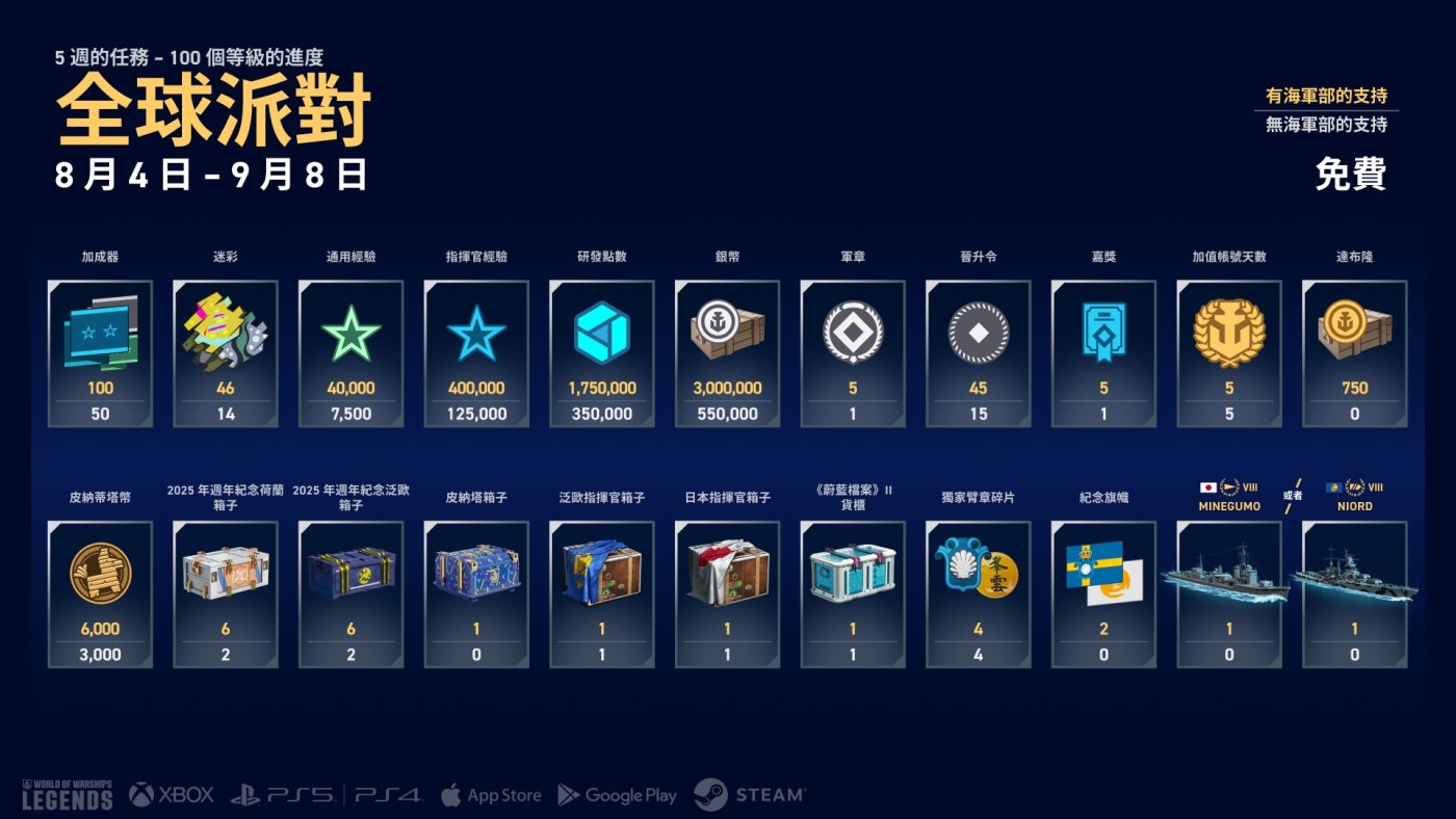 完整戰役獎勵清單如下。請注意,本次所有獎勵(包括那些有「海軍部的支持」才能獲得的獎勵)通通都是免費的!