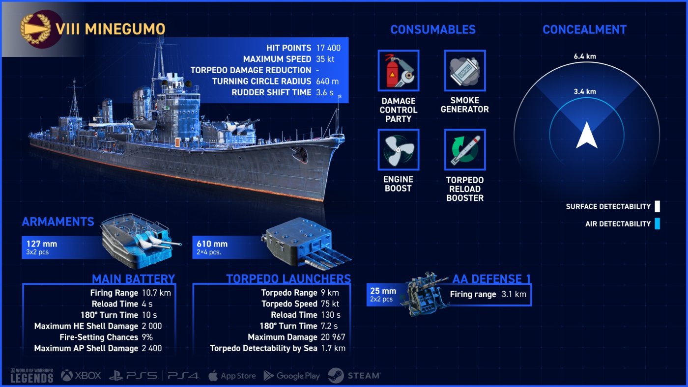 Minegumo 是一艘強大的日本驅逐艦,配備強大的主炮和穿透力較高的砲彈,還有可單獨發射的高速魚雷,使其能造成巨大傷害。結合「魚雷裝填助推器」和冷卻快速的「發煙機」消耗品,使她足以對其他驅逐艦和大型艦艇構成真正的威脅。