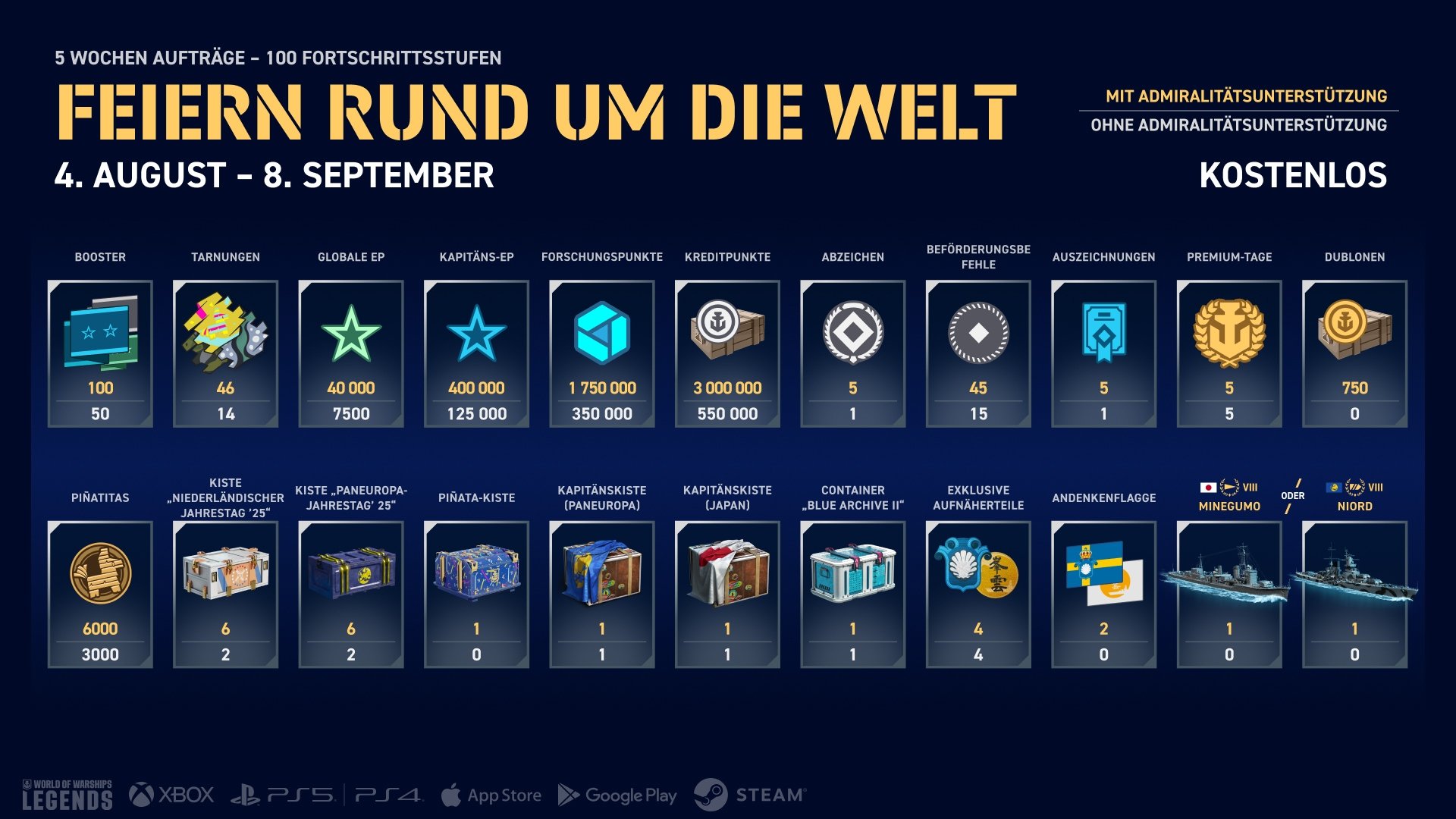Feste feiern und feste feiern, rund um die Welt – darum geht es im neuen Feldzug! Holt euch die kostenlose Admiralitätsunterstützung und schließt im Laufe der nächsten 5 Wochen 100 Meilensteine ab, um euch jede Menge Belohnungen zu holen, darunter ein neues Schiff: den japanischen Stufe-VIII-Premiumzerstörer Minegumo oder das paneuropäische Stufe-VIII-Premiumschlachtschiff Niord. Ihr könnt euch aussuchen, welches der beiden Schiffe ihr gratis erhalten möchtet. Das andere ist dann zum Kauf mit Dublonen verfügbar.
