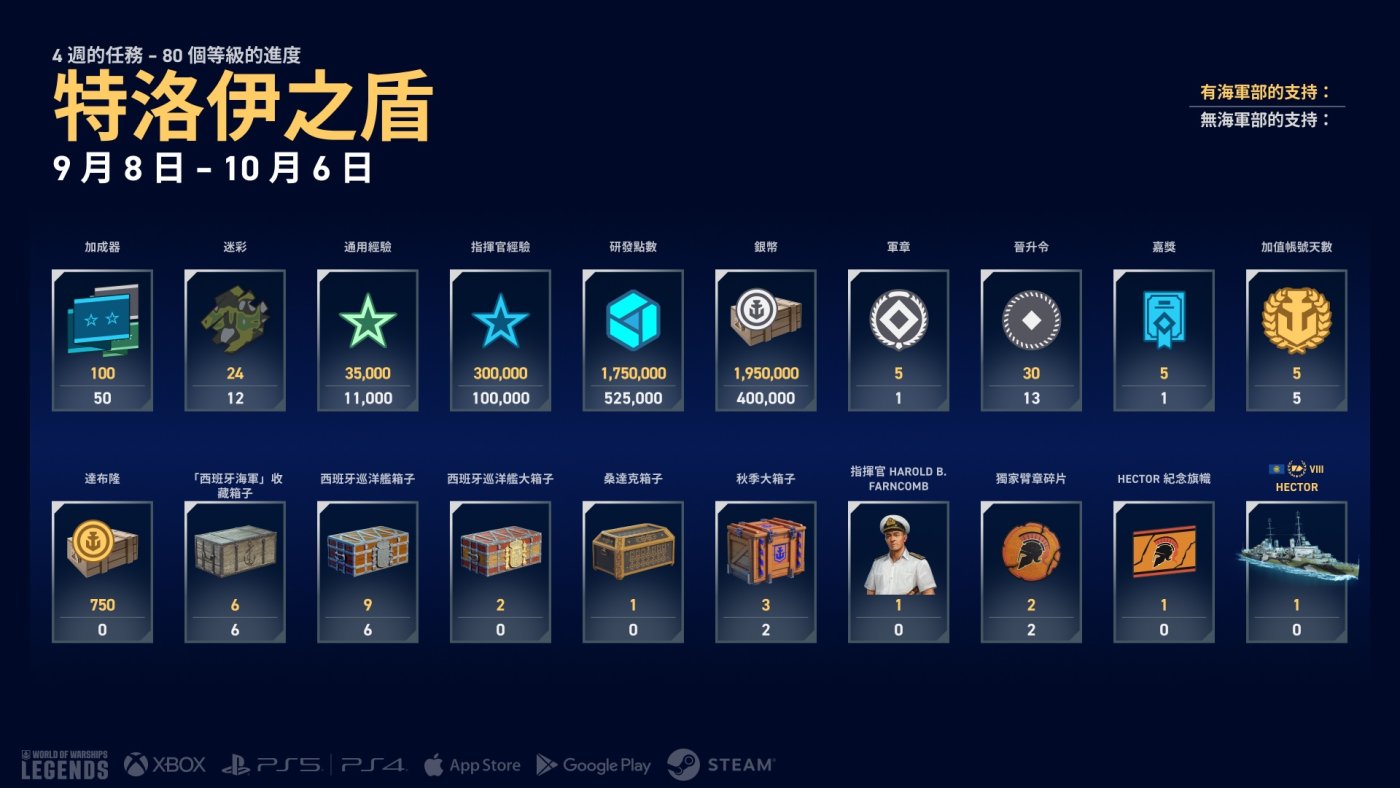 9 月 8 日開始,只要在 4 週內完成 80 個戰役里程碑並啟用「海軍部的支持」,即可解鎖 Hector。如果您錯過挑戰,別擔心:追趕功能可以幫您補上!繼續閱讀以了解完整戰役獎勵清單(有無「海軍部的支持」都能獲得獎勵)。