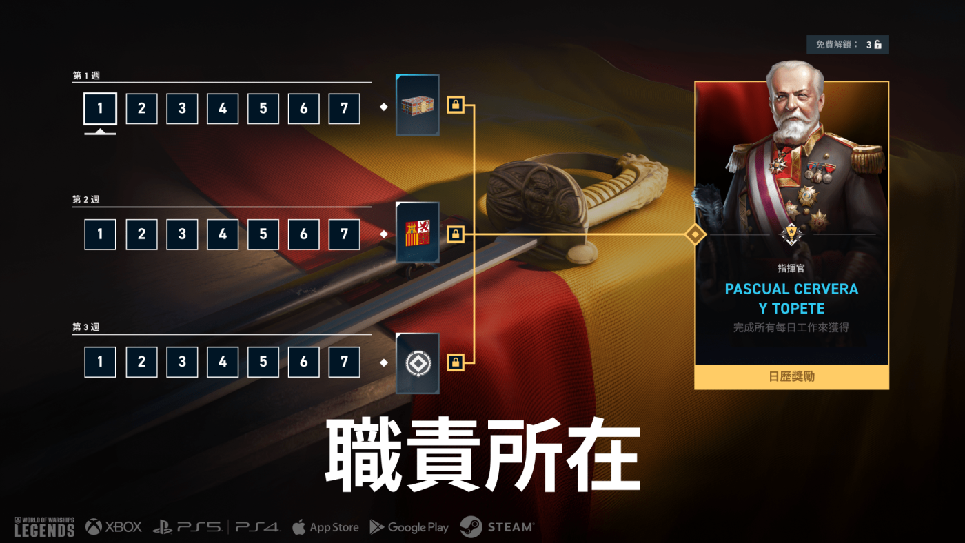 9 月 8 日起,查看這個為期 3 週的新日曆,主要獎勵為西班牙指揮官 Pascual Cervera y Topete。您最多可免費補上錯過的 3 天,但在頭 3 週過後您就只剩 1 週的時間能進行此操作,因為本次版本持續時間為 4 週,而非通常的 5 週。其他獎勵包括一個有機率掉落搶先體驗艦艇的西班牙巡洋艦大箱子!