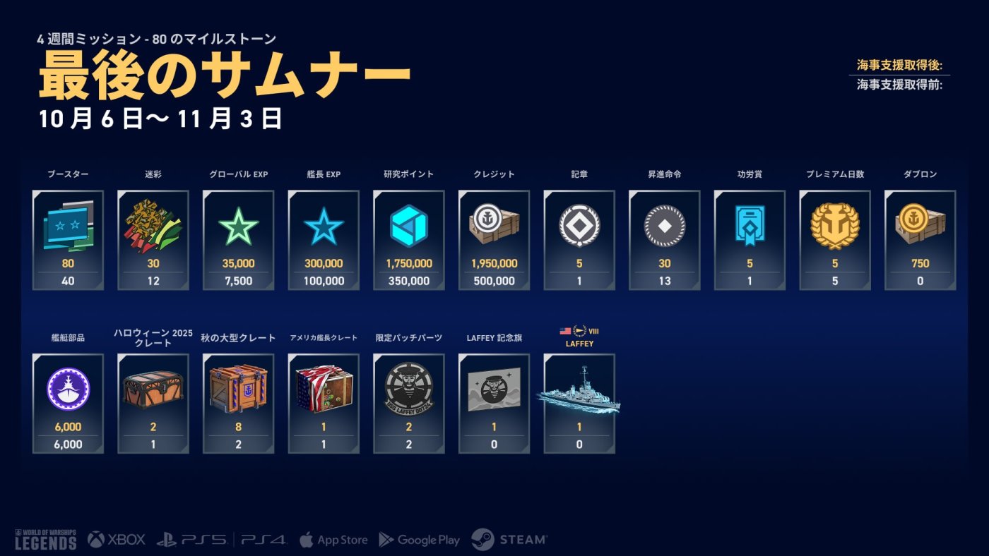 前回のキャンペーンと同じく、「最後のサムナー」キャンペーンも普段より少し短めの、4 週間 80 マイルストーンの構成となります。いつも通り、キャンペーン期間中なら、やり損ねたチャレンジを後から行うことが可能です。有効な海事支援を持って完了することで、アメリカ Tier VIII プレミアム駆逐艦「Laffey」と他の多くの褒賞を獲得できます。このアップデートの期間中は、通常戦、アーケードバトル、AI 戦に加えて、ハロウィーンのモードでもキャンペーンのタスクを完了できます。また、ハロウィーン・モードをプレイして「Laffey」専用の不気味なスキンを獲得するのもお忘れなく!