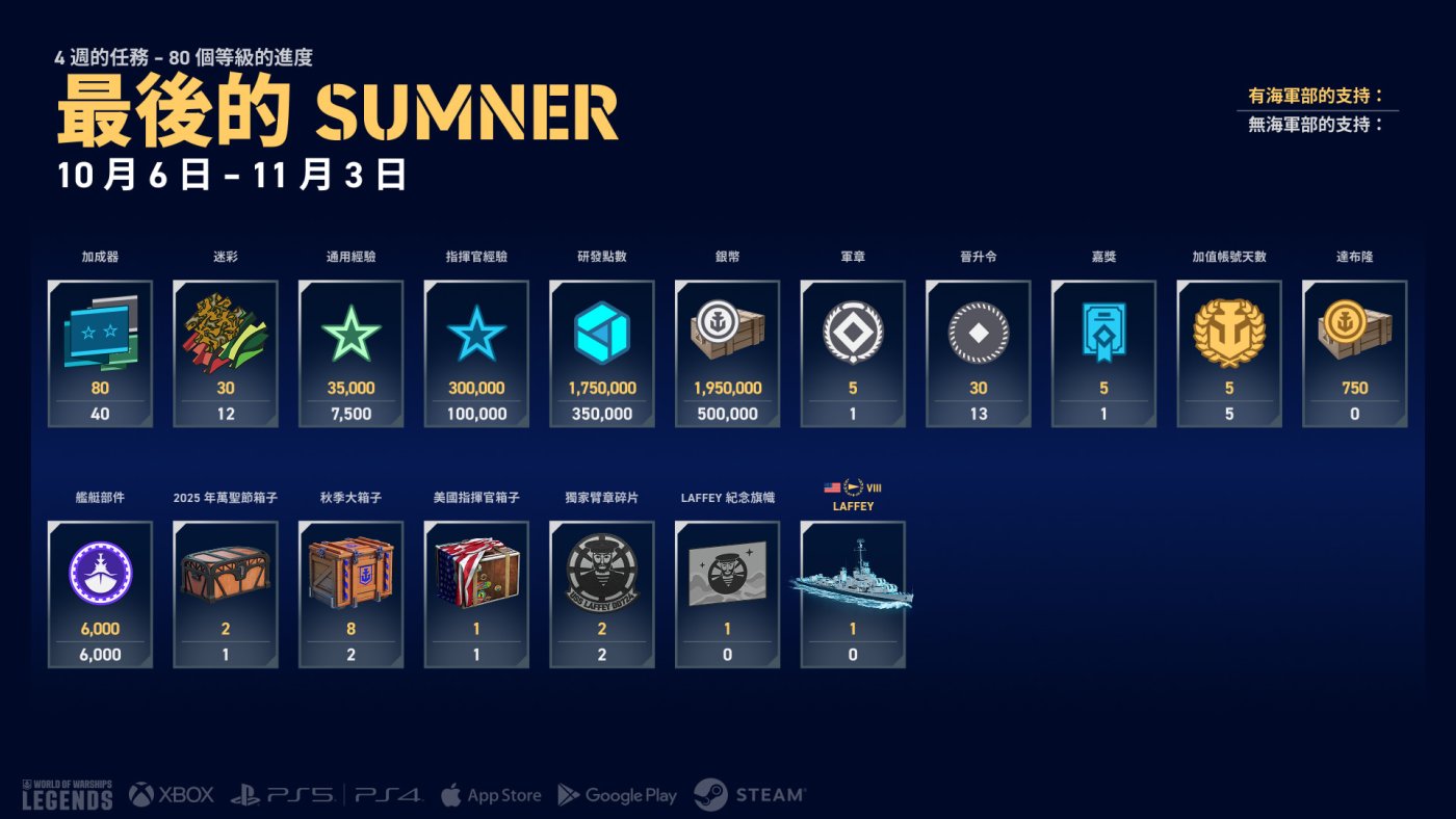與先前的更新類似,「最後的 Sumner」戰役會比以往略短,為期 4 週、共 80 個里程碑,並提供追趕錯過挑戰的選項。在啟用「海軍部的支持」下完成,即可獲得美國 VIII 階加值驅逐艦 Laffey 和許多其他獎勵。本次版本期間,除了一般戰鬥、街機模式和人機對戰外,您也可以在萬聖節模式中完成戰役工作。另外,別錯過在萬聖節模式中獲得 Laffey 毛骨悚然表皮的機會!