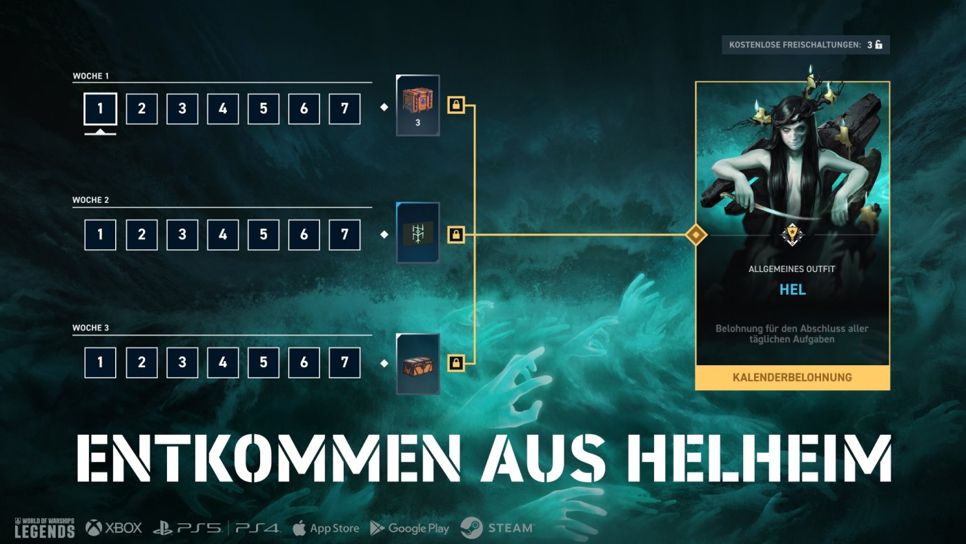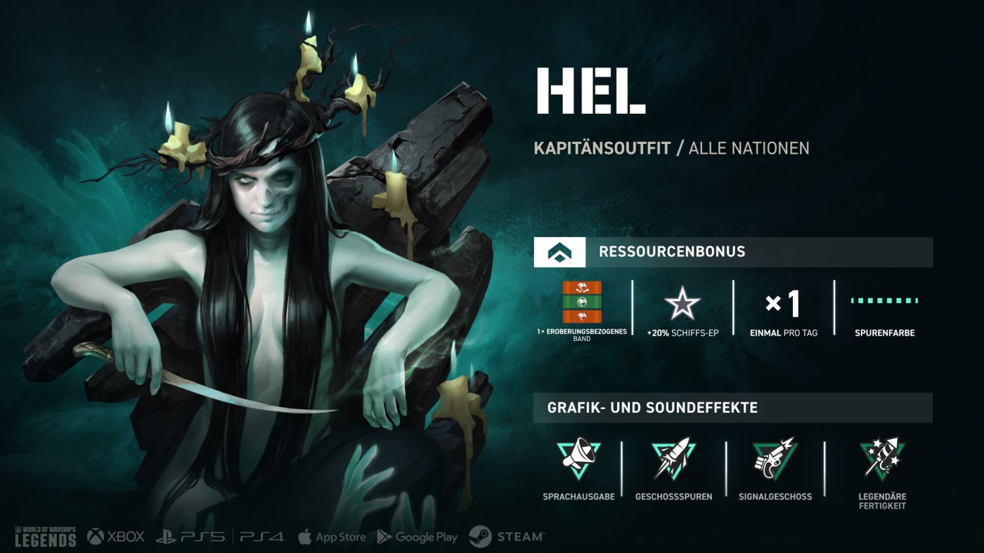 Hel, die Göttin der Unterwelt, ist in Legends eingetroffen! Ihr tut gut daran, sie auf eure Seite zu ziehen – und genau das könnt ihr mit dem neuen Kalender. Fangt am 6. Oktober damit an und schließt 3 Wochen lang alle täglichen Aufgaben ab, um das Kapitänsoutfit „Hel“ und viele andere Belohnungen freizuschalten, unter anderem eine Kiste „Halloween ’25“, die Flagge „Hels Zeichen“ und große Kisten „Herbst“.