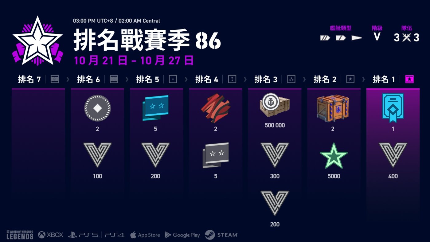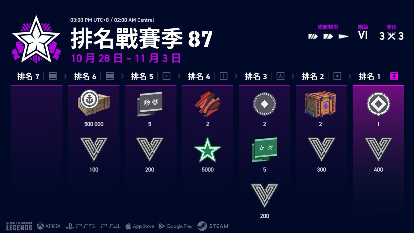 您將以三人小隊參加 — 一個賽季使用 V 階艦艇,而另一個賽季則為 VI 階。一如既往,您的目標是透過贏得戰鬥來收集星星、提升排名,然後獲得獎勵。如果您的隊伍輸了或以平手收場,就會失去一顆星星,除非您獲得了置身己隊最多的經驗。只要達到最高排名就會終止您參與每個賽季。