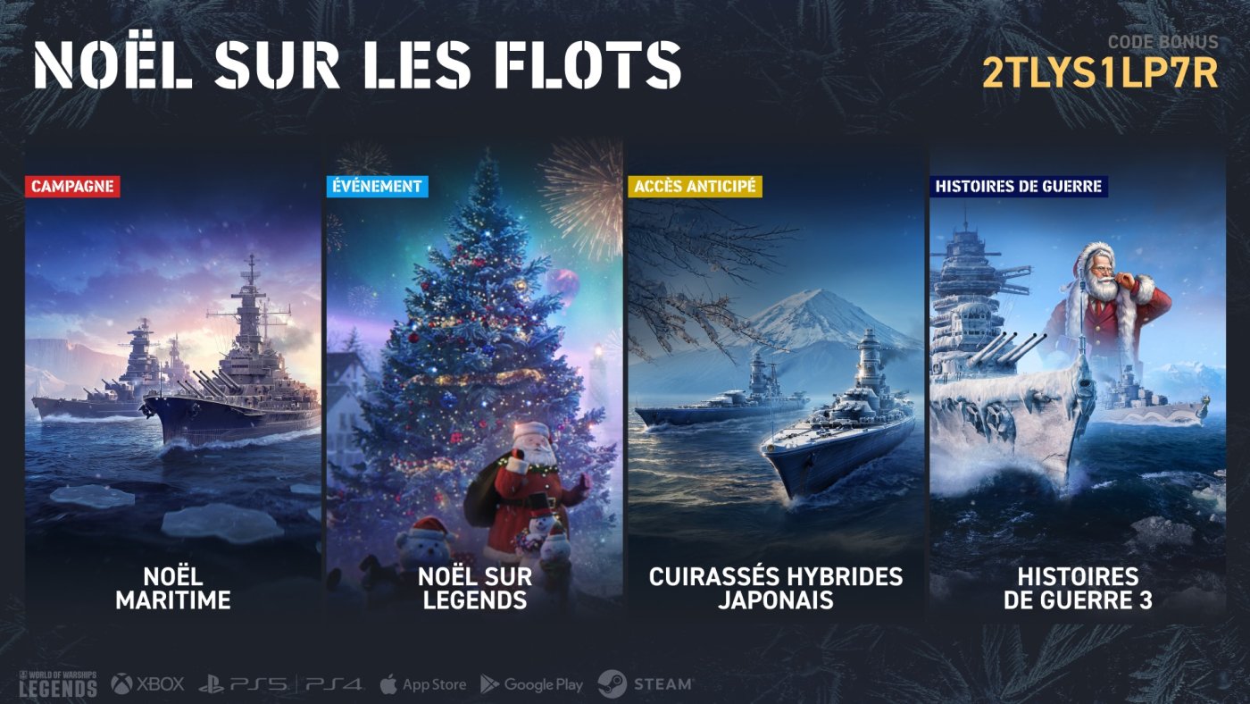 Si vous n'avez toujours pas accumulé assez de Pièces de navire pour déverrouiller le cuirassé givré Lugdunum, vous avez encore le temps de rattraper votre retard ! Du 1er décembre au 19 janvier, achevez la campagne gratuite Noël maritime et la mission Route vers le Nouvel An afin de gagner assez de Pièces de navire pour vous procurer ce vaisseau en plus d'autres récompenses. C'est toujours possible, même si vous n'avez pas encore commencé le marathon ! Voici le nombre de Pièces de navire que vous pouvez gagner pendant la mise à jour :