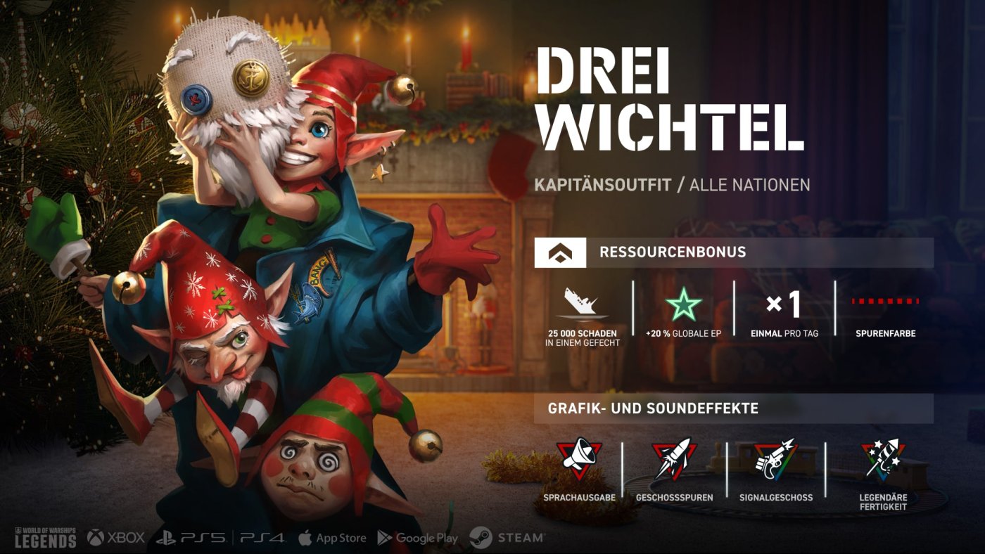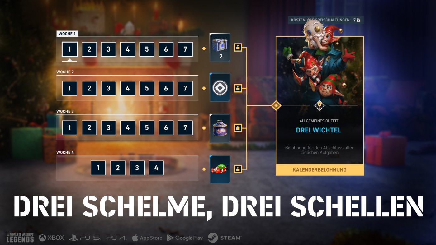 Startet am 1. Dezember den neuen Adventskalender „3 Schelme, 3 Schellen“ und schließt 25 Tage lang täglich Aufgaben ab, um haufenweise Belohnungen zu erhalten – einschließlich der letzten: einem schlitzohrigen Wichteltrio, das in euren Gefechten für Spaß und Chaos sorgt. Keine Sorge, wenn ihr ein paar Tage verpasst – ihr könnt bis zu 7 Tage gratis nachholen.