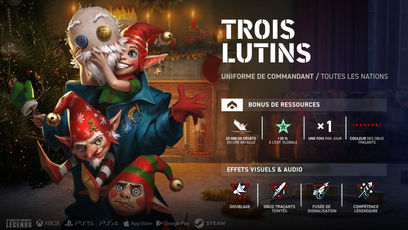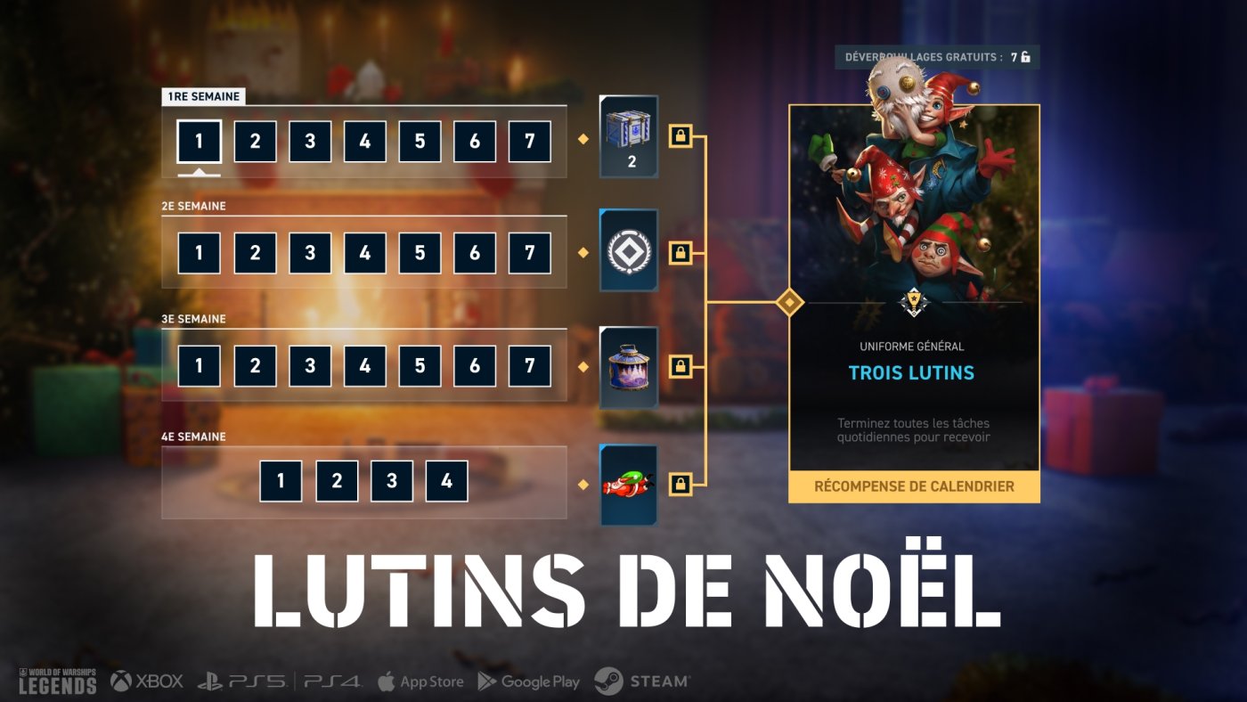 Commencez le calendrier de l'avent Lutins de Noël dès le 1er décembre et accomplissez les tâches quotidiennes durant 25 jours pour recevoir une hotte entière de récompenses, la dernière étant un trio de lutins espiègles qui amènera du fun et de la zizanie dans vos batailles. Si vous ratez quelques jours, ne vous en faites pas : vous pourrez en rattraper jusqu'à sept gratuitement.