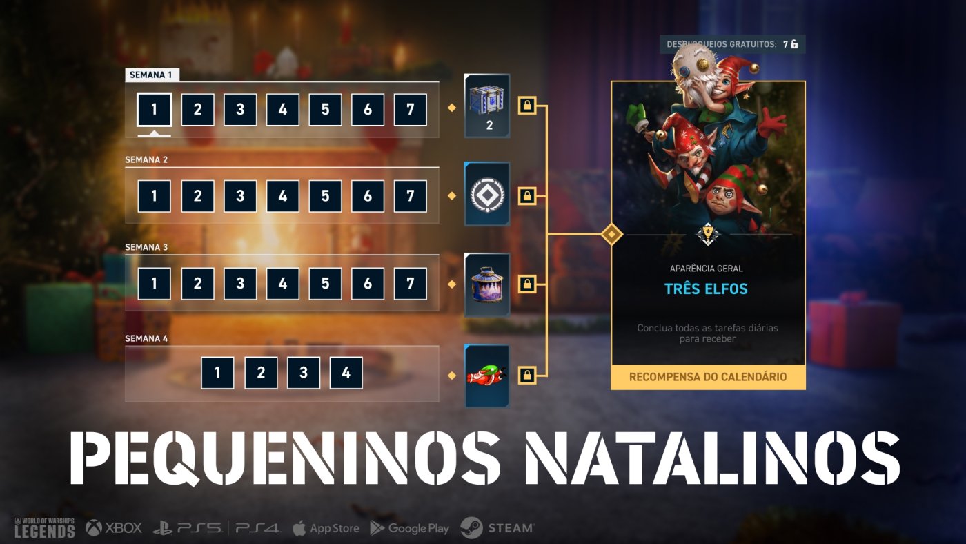 Comecem o novo Calendário do Advento "Pequeninos Natalinos" em 1 de dezembro e concluam tarefas diárias por 25 dias para receber várias recompensas, incluindo um trio de elfos arteiros que trará caos diversão às suas batalhas. É possível recuperar até sete dias perdidos sem custo.