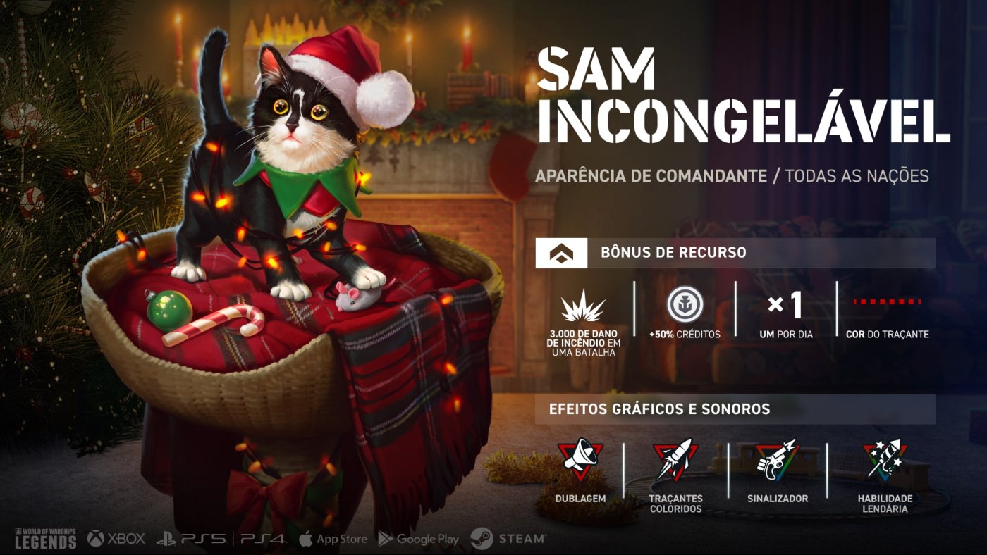Além das novas aparências de Comandante e visuais Congelado, vocês também podem trocar Tokens de Natal por visuais nevados e aparências de Comandante de anos anteriores, caixas Lanterna Mística e Caixa Mística, Caixas Grandes de Inverno, itens de progressão de Comandante e um cupom de 70% de desconto em navios Premium na Loja.