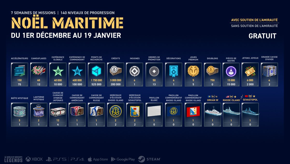 La campagne Noël maritime est déjà sortie : pensez à récupérer le Soutien de l'Amirauté gratuit ! Cette campagne est plus longue que d'habitude et est composée de 140 paliers à franchir en 7 semaines. Venez-en à bout afin de recevoir de nombreuses récompenses et le choix entre deux navires : le cuirassé américain légendaire Rhode Island ou le croiseur soviétique légendaire Sevastopol. Celui que vous choisirez sera à vous gratuitement, tandis que vous pourrez acheter l'autre avec des doublons (depuis la fenêtre de la campagne, une fois celle-ci terminée).