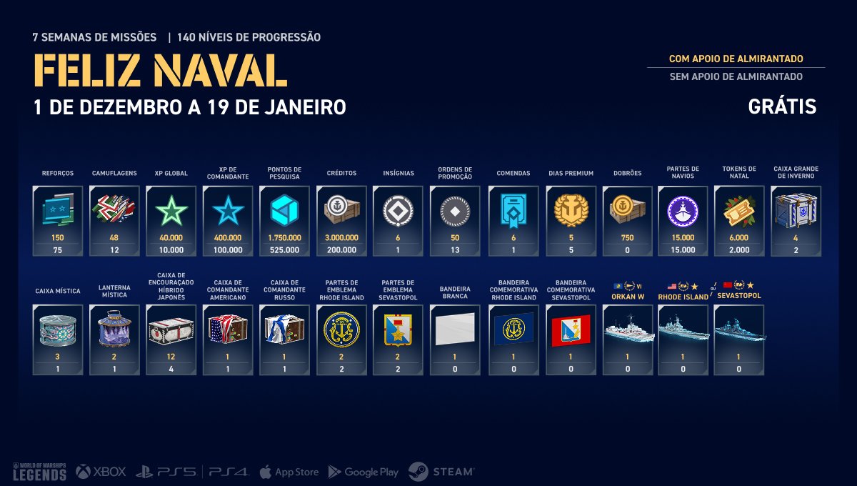 Para concluir a campanha "Feliz Naval" e receber um navio Nível Lendário de graça, você precisa acumular 3.475 pontos de Renome com um Apoio do Almirantado ativo, que está disponível gratuitamente durante esta atualização. Concluindo todas as missões da Devastação Semanal, você receberá 3.500 pontos de Renome no total. Além disso, concluindo todas as missões da Devastação Semanal e Esforço Heroico, você receberá 4.900 pontos de Renome no total. Os jogadores com um Apoio do Almirantado ativo podem concluir a missão de Proeza de Batalha semanal especial para ganhar até 875 pontos de Renome e acelerar o progresso da campanha.