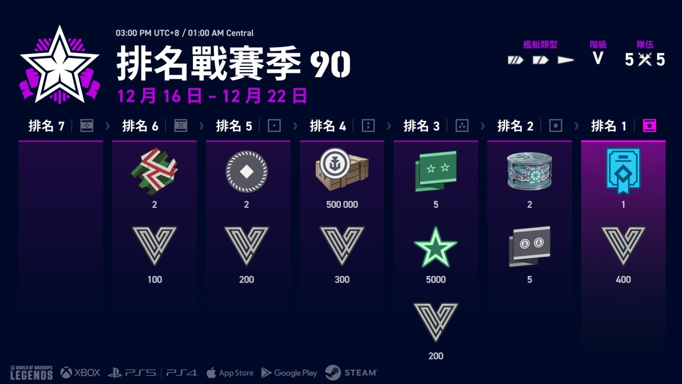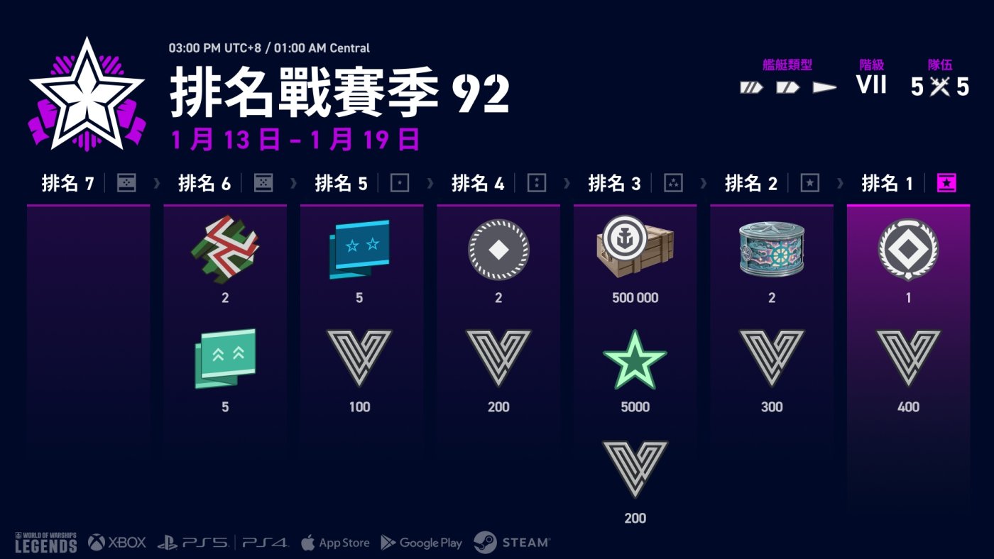 排名戰帶著三個新賽季回來啦,主打 V–VII 階主力艦、巡洋艦,以及驅逐艦的 5 對 5 戰鬥。想要提升排名,您必須贏得戰鬥並獲得星星。如果您的隊伍被擊敗或以平手收場,您就會失去一顆星星,但有一個例外 — 只要您獲得了置身己隊第一名的經驗,就能留住星星。