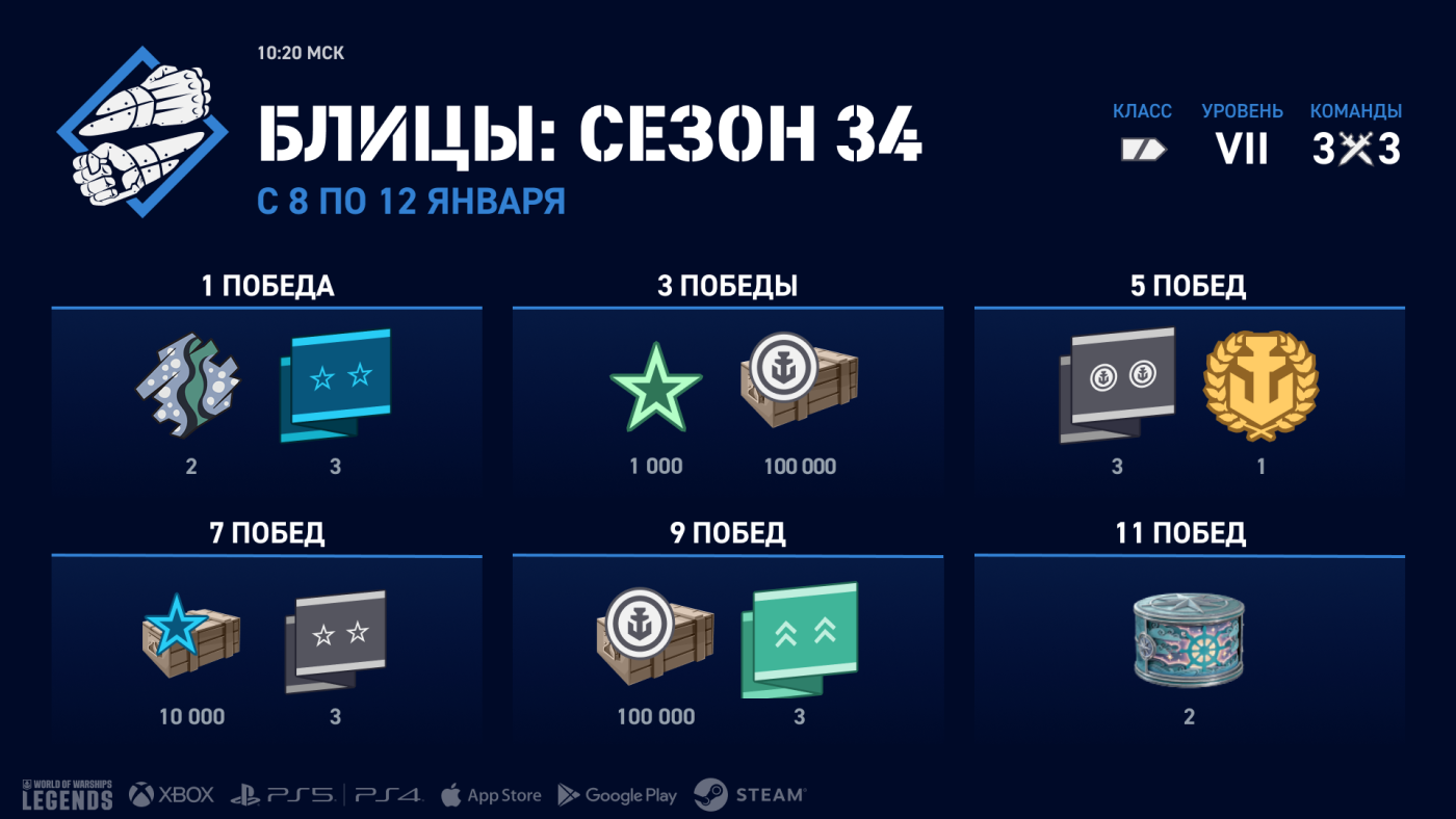 Встречайте два новых сезона блицев! Бои будут проходить между командами из трёх игроков каждая на линкорах VI уровня в 33‑м сезоне и на крейсерах VII уровня в 34‑м. Как обычно, различные игровые механики претерпят изменения. Будут доступны боевые приказы — особые улучшения, которые предлагаются дважды за бой. Они включают одно улучшение наступательного характера и одно — оборонительного. Ниже мы приводим подробную информацию о каждом сезоне.