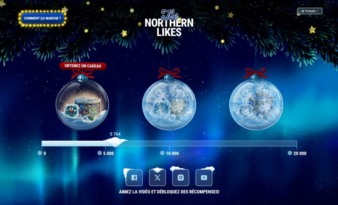Notre évènement de Noël spécial, intitulé « Les J'aime du Nord », commence maintenant ! Soutenez cette nouvelle vidéo avec vos likes sur les quatre plateformes de réseaux sociaux (Facebook, X, Instagram et YouTube) pour débloquer trois paliers de récompenses : 1 Boîte mystérieuse, 2 000 Jetons Joyeux et 1 Lanterne mystique. Chaque récompense s'accompagne également un symbole d'écusson unique.