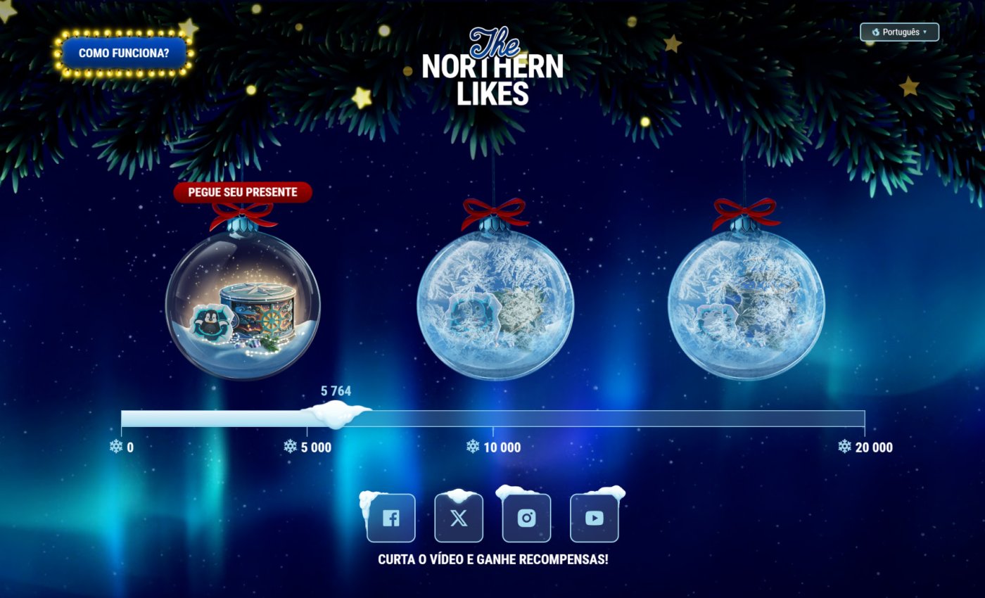 Nosso evento especial de Natal, "Curtidas Boreais", começa agora! Apoiem o novo vídeo com suas curtidas no Facebook, X, Instagram e YouTube para desbloquear três níveis de recompensas: 1 Caixa Mística, 2.000 Tokens de Natal e 1 Lanterna Mística. Cada recompensa também vem com um símbolo de emblema exclusivo.