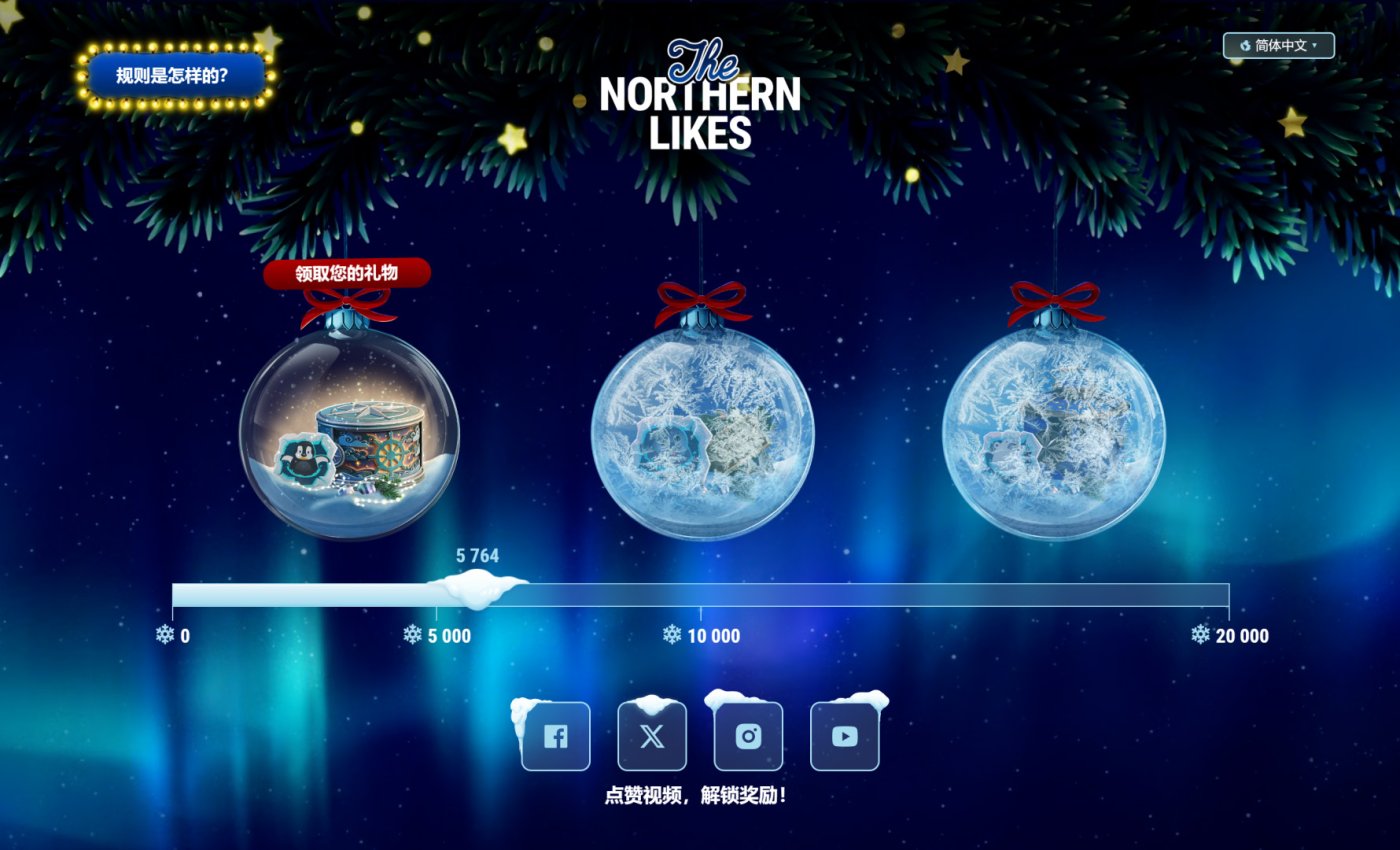 我们的特殊圣诞活动“北方点赞”现已开启! 在Facebook、X、Instagram和YouTube四大社交平台为视频点赞,即可逐步解锁三档奖励:1x 神秘宝箱、2,000欢乐代币,以及1x 神秘灯笼。 每档奖励均附赠一款独特的补丁符号。