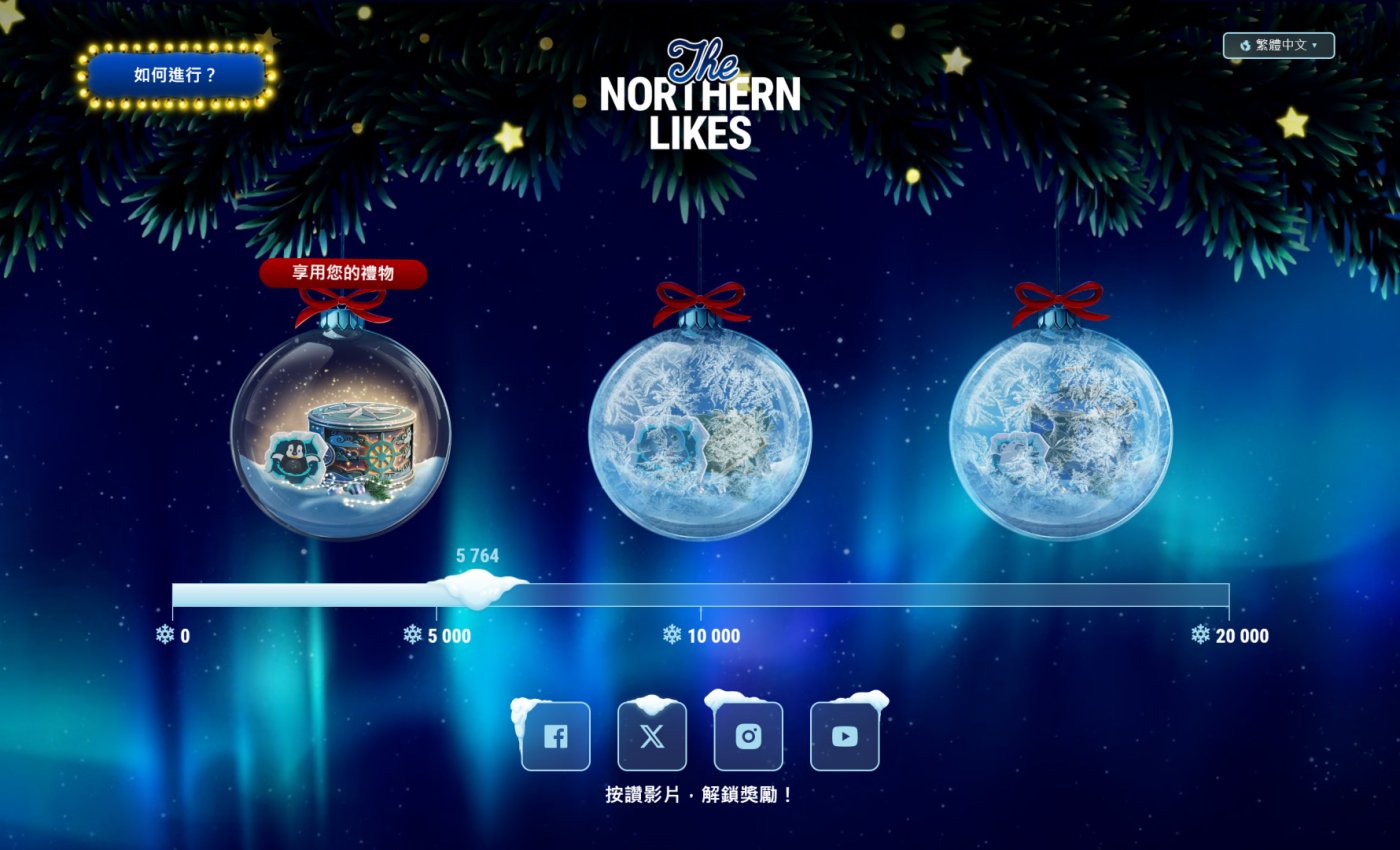 我們的聖誕節特別活動「Northern Likes」現在正式開跑!在以下四種社群媒體平台 — Facebook、X、Instagram,以及 YouTube — 按讚支持新影片即可解鎖三階段獎勵:1x 神秘盒子、2,000 歡樂幣,以及 1x 神秘提燈。每個獎勵還會隨附一個獨特的臂章圖樣。