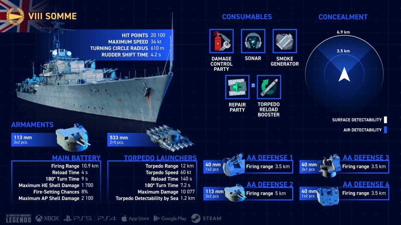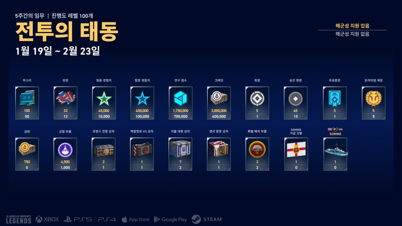 1월 19일부터 2월 23일까지 전투의 태동 신규 캠페인에 참여할 수 있습니다. 해군성 지원과 함께 완료하여 영국 8단계 프리미엄 구축함 Somme과 풍성한 보상을 받으십시오. Somme은 어뢰 화력에 집중한 Battle급 구축함으로, 은밀한 장거리 어뢰와 횟수 제한이 없는 어뢰 장전기를 탑재했습니다. 어뢰 공격력 자체는 그다지 높지 않지만, 어뢰 장전기의 재사용 대기시간이 어뢰 장전 시간과 같아, 말 그대로 적군에게 어뢰를 퍼부어버릴 수 있습니다. Somme은 함포 성능도 양호하여, 다채로운 플레이를 펼칠 수 있습니다.