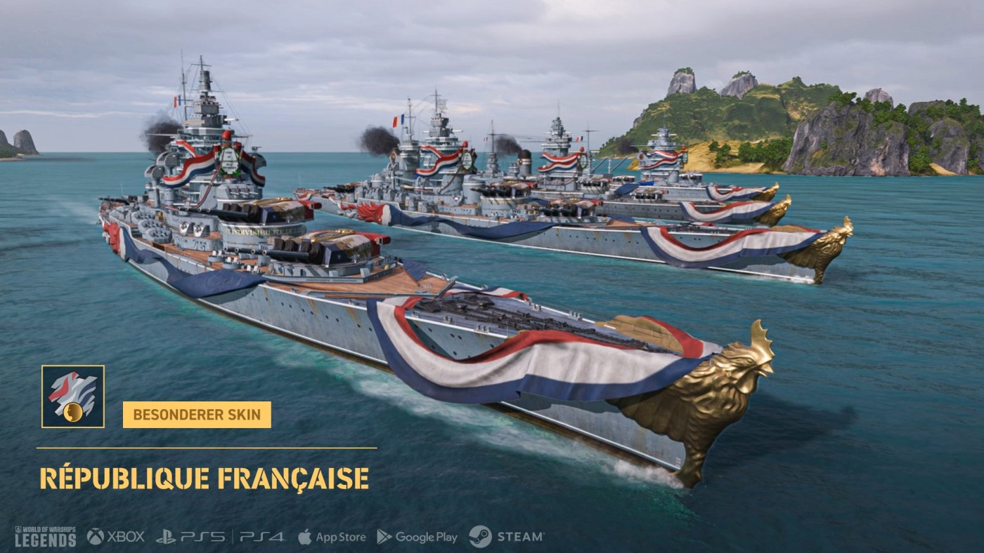 In diesem Update gibt es neue Skins „République Française“ für sieben französische Premiumschlachtschiffe: Normandie (Stufe V), Lyon (Stufe VI), Strasbourg (Stufe VI), Richelieu (Stufe VII), Flandre (Stufe VII), Alsace (Stufe VIII) und Bourgogne (legendäre Stufe). Diese Skins sind einzeln im Shop erhältlich und können auch in der Kiste „Französische Schlachtschiffe“ stecken. Egal, wie ihr sie euch holt, jeder Skin bringt 500 Schiffsteile als Bonus mit, damit ihr im Marathon zum sowjetischen legendären Schlachtschiff Kremlin schneller vorankommt.