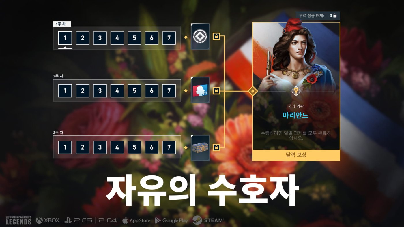 프랑스 테마 활동의 일부로, 1월 19일부터 3주간 자유의 수호자 신규 달력이 열립니다. 달력의 일일 과제를 모두 완료하면 마리안느 함장 외관부터 프랑스 전함 상자, 특별 깃발 등 다양한 보상을 받을 수 있습니다.