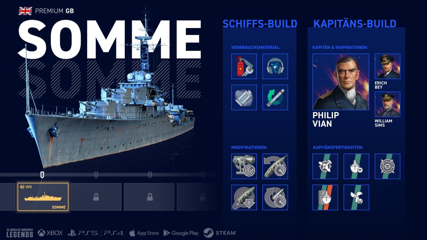 Die Somme ist außerdem wie die meisten britischen Zerstörer mit guten Geschützen ausgestattet, was einen vielseitigen Spielstil ermöglicht. Auch die nützliche Kombination aus Sonar und schnell ladendem Nebelerzeuger mit kurzer Dauer ist für britische Zerstörer typisch.