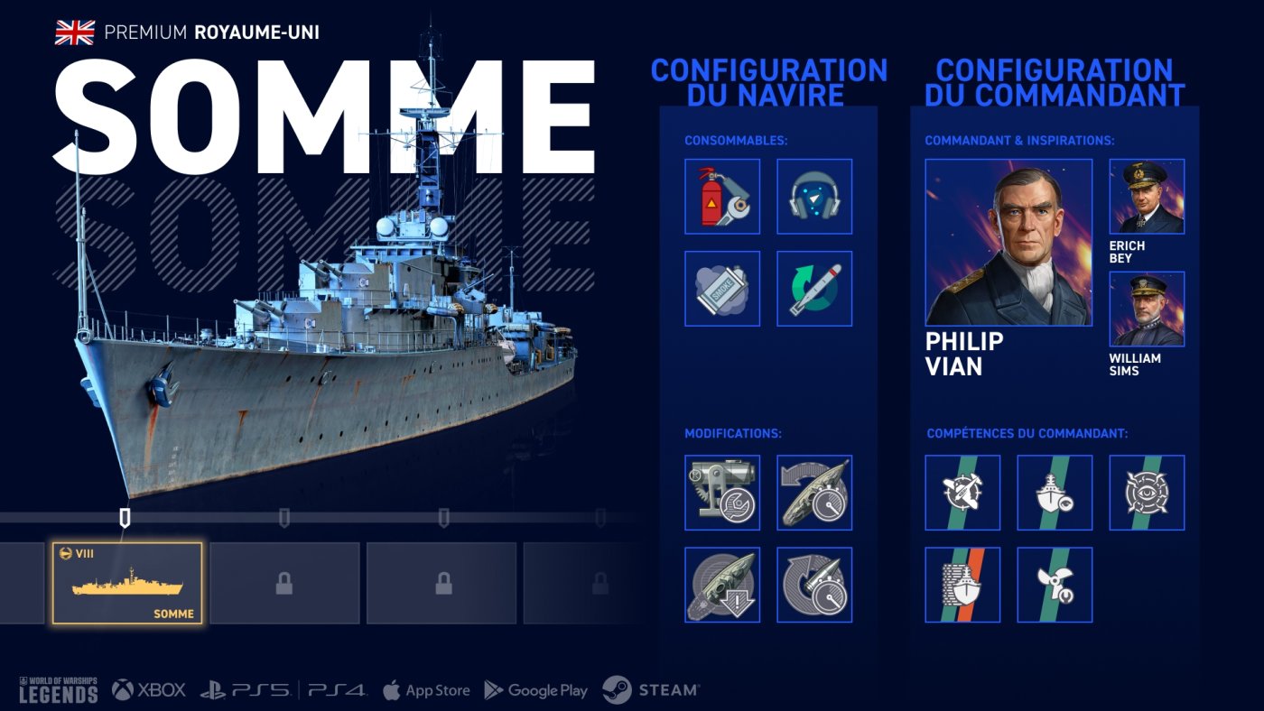 Par ailleurs, le Somme conserve la bonne artillerie typique des destroyers britanniques, lui conférant un style de jeu polyvalent. Il bénéficie en outre de la puissante combinaison propre aux destroyers britanniques : un Générateur de fumée bref mais qui revient vite couplé à Sonar.