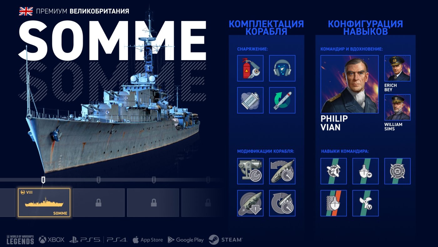 Somme также вооружён неплохими орудиями ГК, отличительной чертой британских эсминцев. Так что этот корабль подходит для разных стилей игры. Кроме того, он оснащён «Дымогенератором» с быстрой перезарядкой и коротким временем действия и «Сонаром» — это мощное сочетание снаряжения также типично для британских эсминцев.