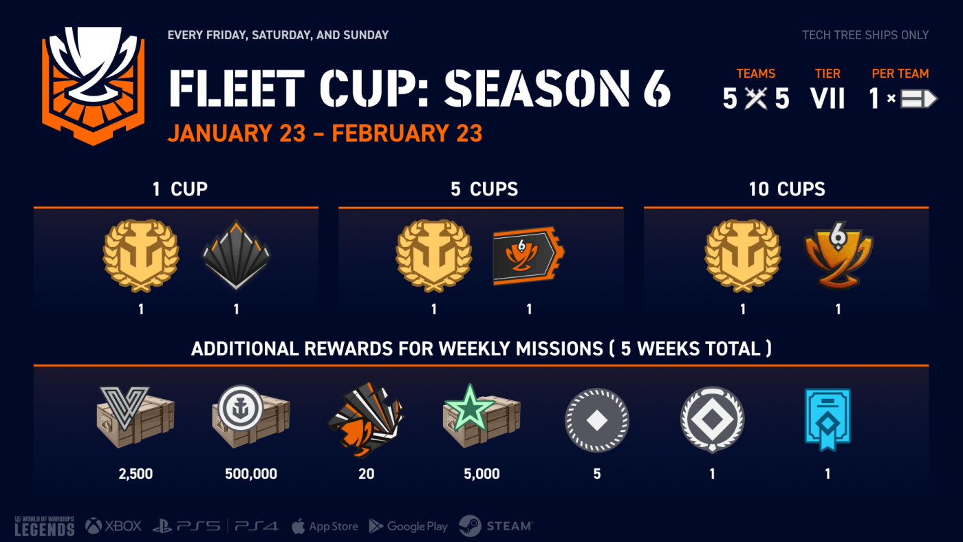 The new Fleet Cup season is starting soon! Battles will run every Friday, Saturday, and Sunday throughout this update: January 23–25, January 30 – February 1, February 6–8, February 13–15, and February 20–22. Gather a team of five and fight at the helms of Tier VII Tech Tree ships, with just one aircraft carrier permitted per team.