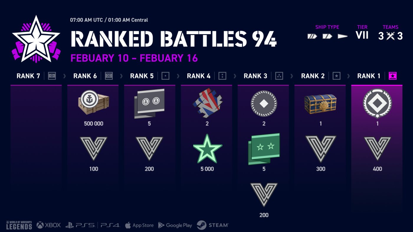 Two new seasons of Ranked Battles arrive in Legends, featuring 3v3 battles with Tier VI and Tier VII ships, excluding aircraft carriers. Win battles, earn Stars, and climb through the ranks to claim rewards! If your team loses a battle or a match ends in a draw, you'll lose a Star unless you're the top XP earner on your team.