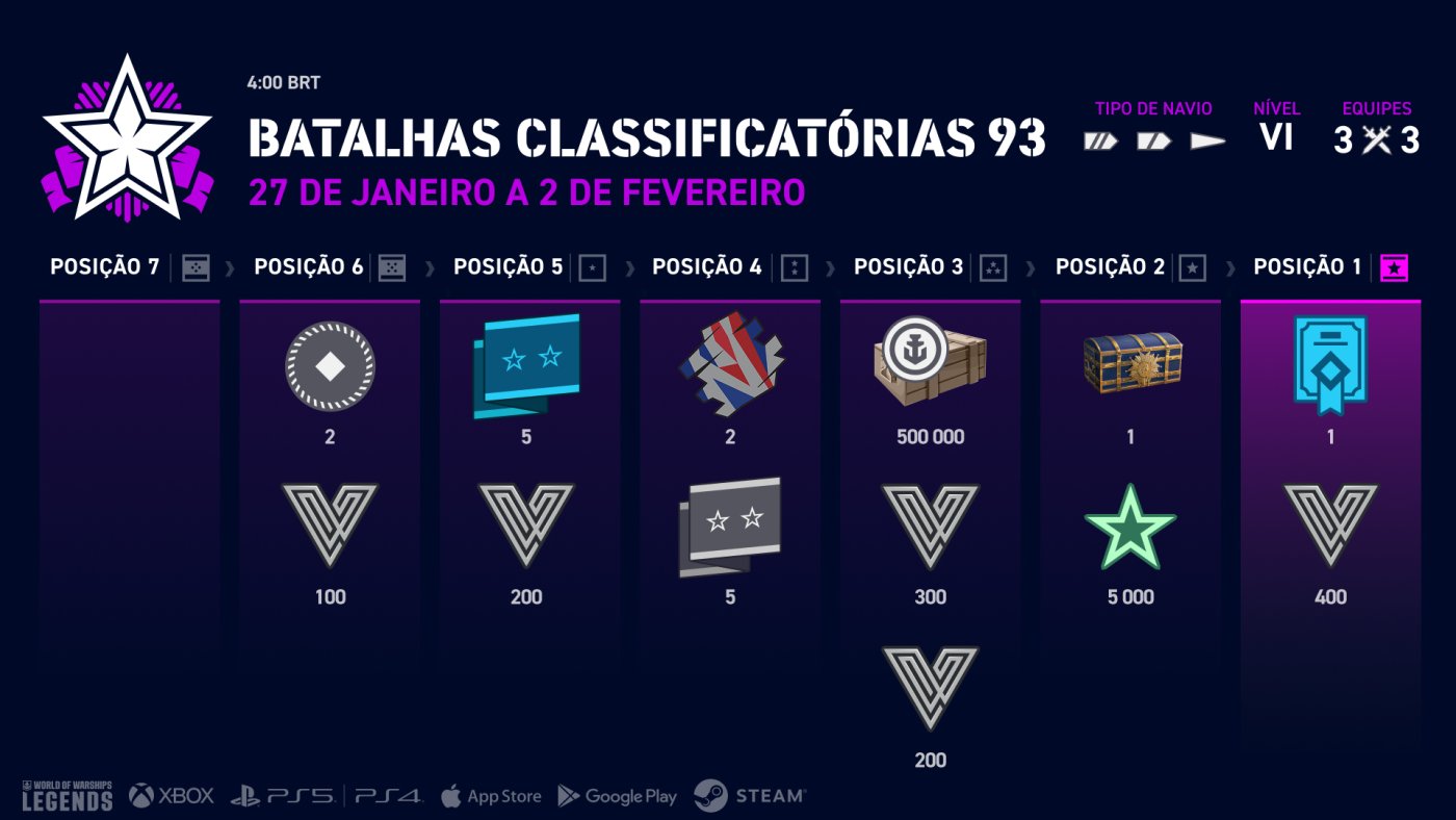 Preparem-se para duas novas temporadas de Batalhas Classificatórias, com equipes de três jogadores a bordo de navios Nível VI e VII (exceto porta-aviões). Vençam batalhas, ganhem Estrelas e subam na classificação para ganhar recompensas! Se suas equipes perderem ou empatarem a partida, vocês perdem uma Estrela. No entanto, o maior ganhador de XP da equipe pode ficar com a Estrela.
