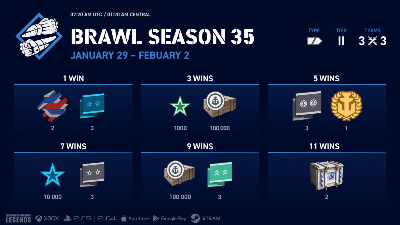 Heat up the winter days with two new Brawl seasons! This time, you'll battle in teams of three, sailing Tier II cruisers and Tier III battleships. To make low-tier ships more enjoyable to play, we're giving significant buffs to their main battery reload time, damage, and traverse speed, as well as consumable cooldown time and travel speed.