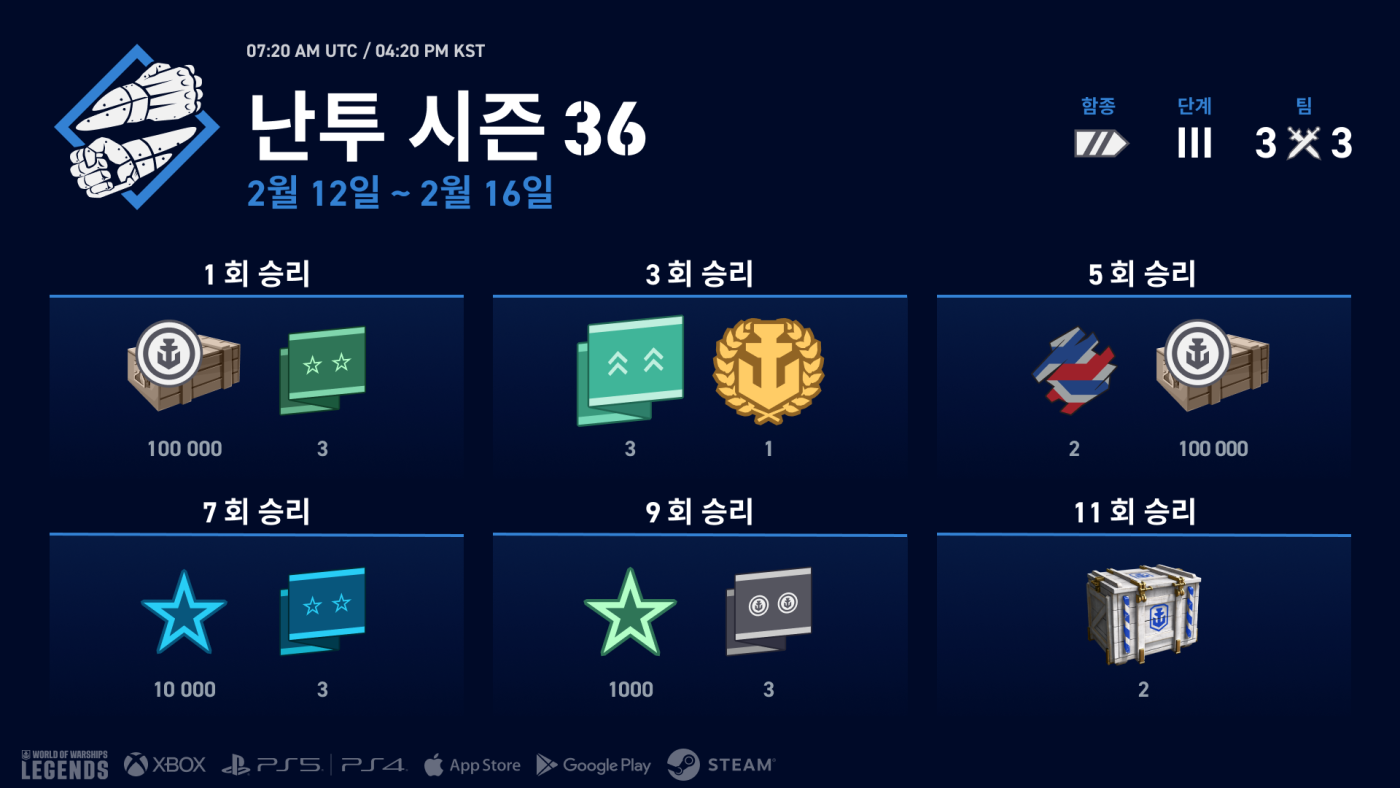 신규 난투 시즌 두 개로 겨울을 뜨겁게 달구십시오! 이번에는 3명이 한 팀이 되어 2단계 순양함과 3단계 전함을 사용합니다. 낮은 단계 군함의 운용이 더 흥미진진해지도록 주함포 재장전 시간, 공격력, 회전 속도, 소모품 재사용 대기시간, 순항 속력을 대폭 강화하였습니다.