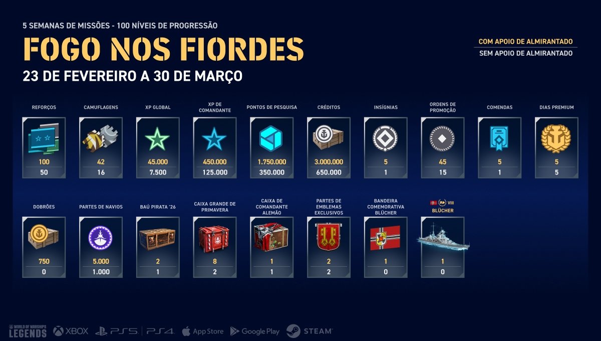 Para concluir a campanha "Fogo nos Fiordes" e desbloquear o cruzador Premium alemão Blücher Nível VIII, você precisa acumular 2.475 pontos de Renome com um Apoio do Almirantado ativo. Concluindo todas as missões da Devastação Semanal, você receberá 2.500 pontos de Renome no total. Além disso, concluindo todas as missões da Devastação Semanal e Esforço Heroico, você receberá 3.500 pontos de Renome no total. Os jogadores com um Apoio do Almirantado ativo podem concluir a missão de Proeza de Batalha semanal especial para ganhar até 625 pontos de Renome e acelerar o progresso da campanha.