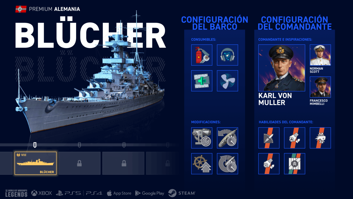 En Legends, el Blücher es un crucero Premium de Nivel VIII que es ideal para un juego enfocado en los proyectiles AP. Este cuenta con ángulos de perforación mejorados y un tiempo de activación de la espoleta ligeramente más corto, lo que mejora el daño que causa con sus proyectiles AP. Su artillería es similar en estilo a la de los cruceros pesados soviéticos. También cuenta con un excelente consumible Impulso del Motor y un Equipo de Reparaciones mejorado. Para agregar al Blücher a sus flotas, completen la campaña “Fuego en los fiordos” con un Respaldo del Almirantazgo activo.