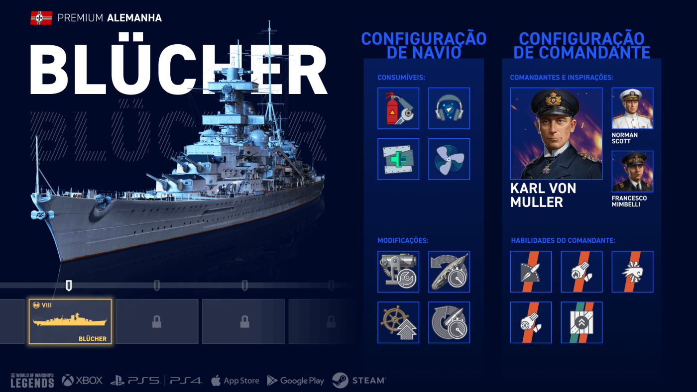 Karl von Müller é a escolha ideal para o comando do Blücher. Sua característica básica "Parrudo" aumenta a velocidade máxima do seu cruzador em até 4%.