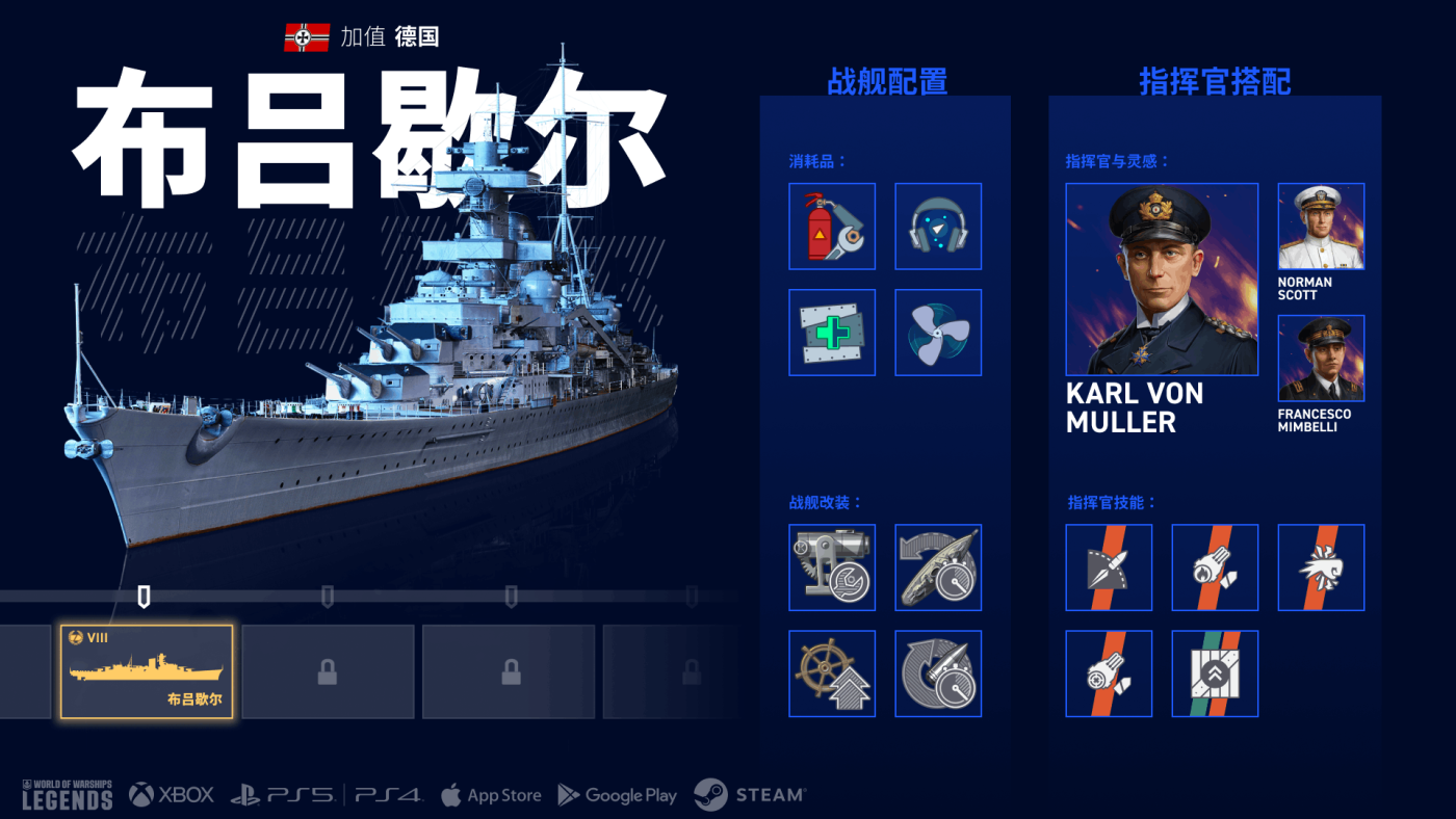 Karl von Müller是布吕歇尔号的绝佳指挥官人选。他的精力充沛基础技能可提升您巡洋舰的最大航速最多4%。