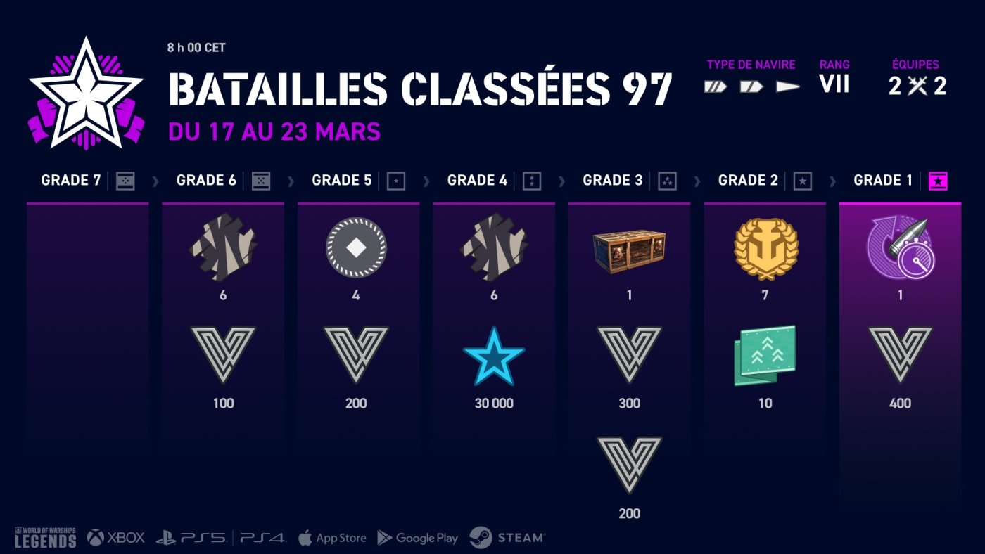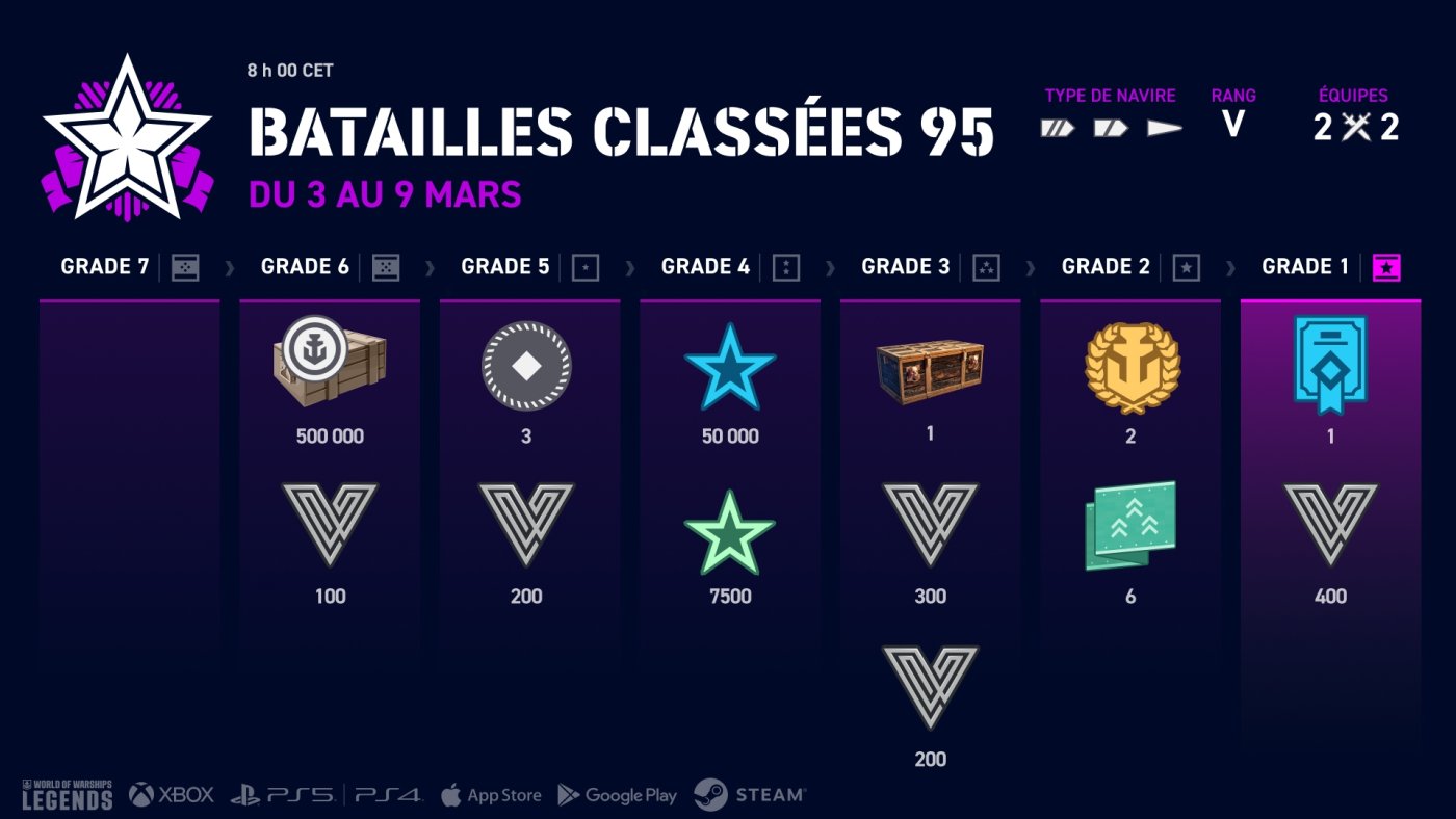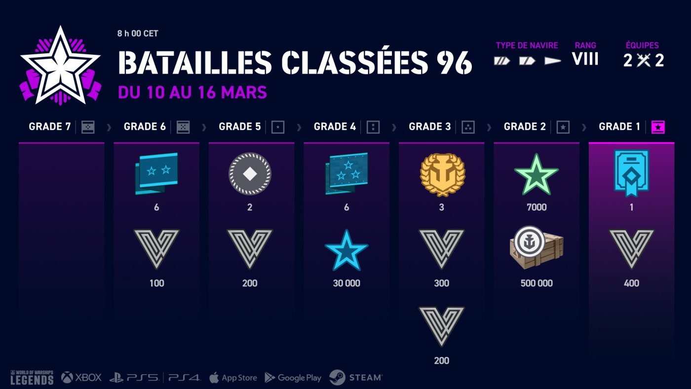Attention : trois saisons de Batailles classées s'annoncent ! Ce coup-ci, les équipes sont très réduites : juste deux joueurs par camp. Vous dirigerez des navires de rang V, VII ou VIII en fonction de la saison. Comme toujours, les porte-avions sont interdits et un seul destroyer par équipe est autorisé.