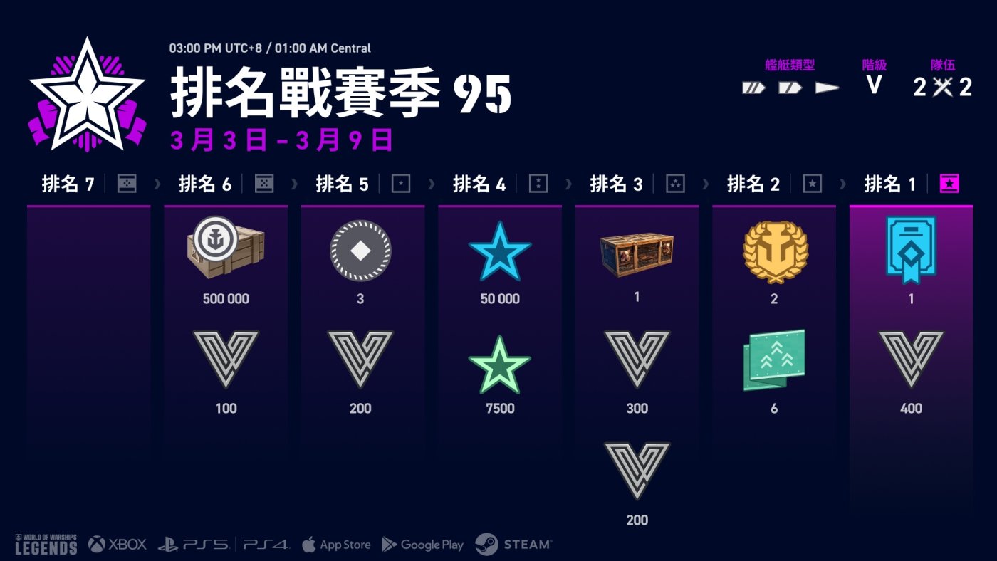 注意:三個新排名戰賽季即將登場!這一次,隊伍變得超小的 — 每邊只有兩位玩家。您將指揮 V、VII,或 VIII 階艦艇,具體條件取決於賽季。一如既往,禁止使用航空母艦,每隊只允許一艘驅逐艦。