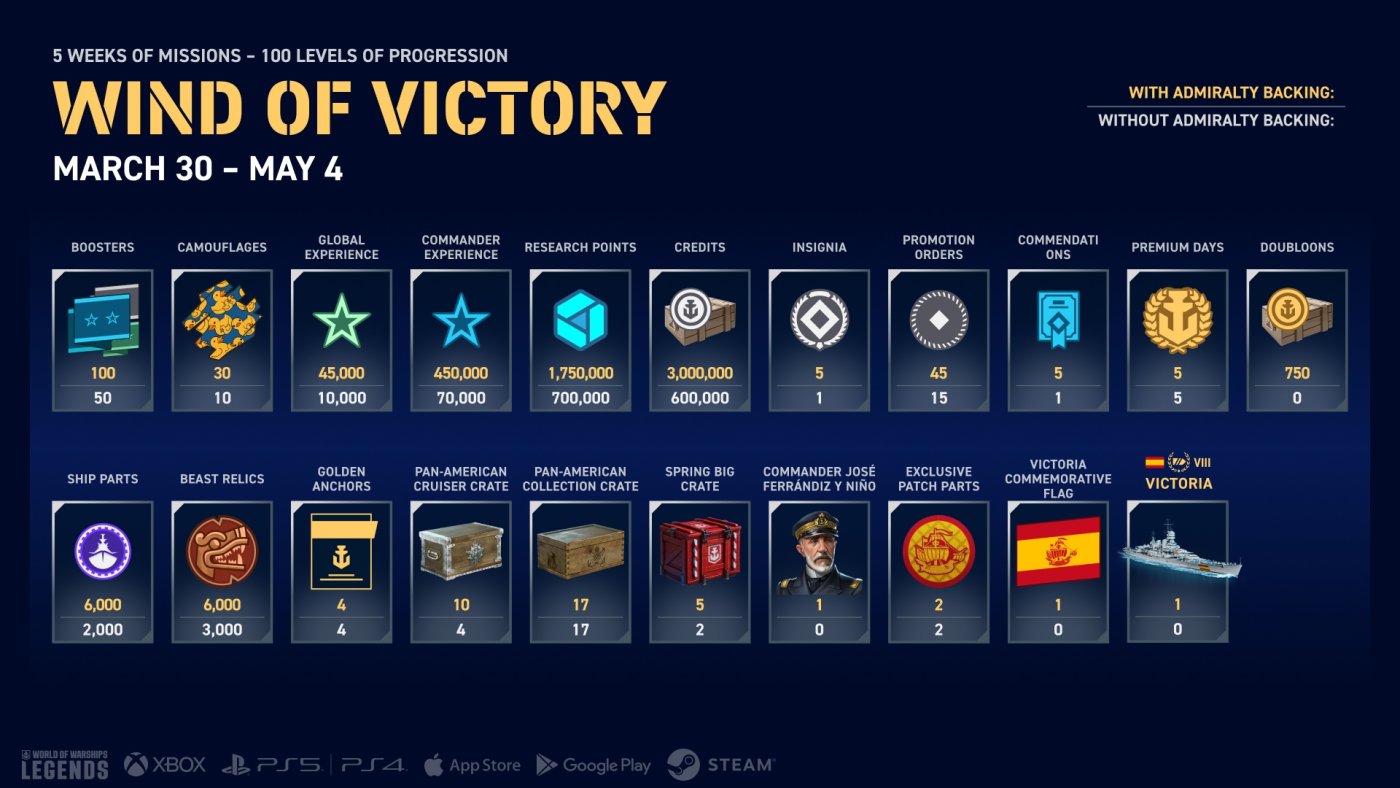 To receive Victoria and all the other rewards, complete the campaign's 100 milestones with an Admiralty Backing. As always, the catch-up mechanic is available for those who miss any challenges. Check out the complete list of campaign rewards available with and without Admiralty Backing: