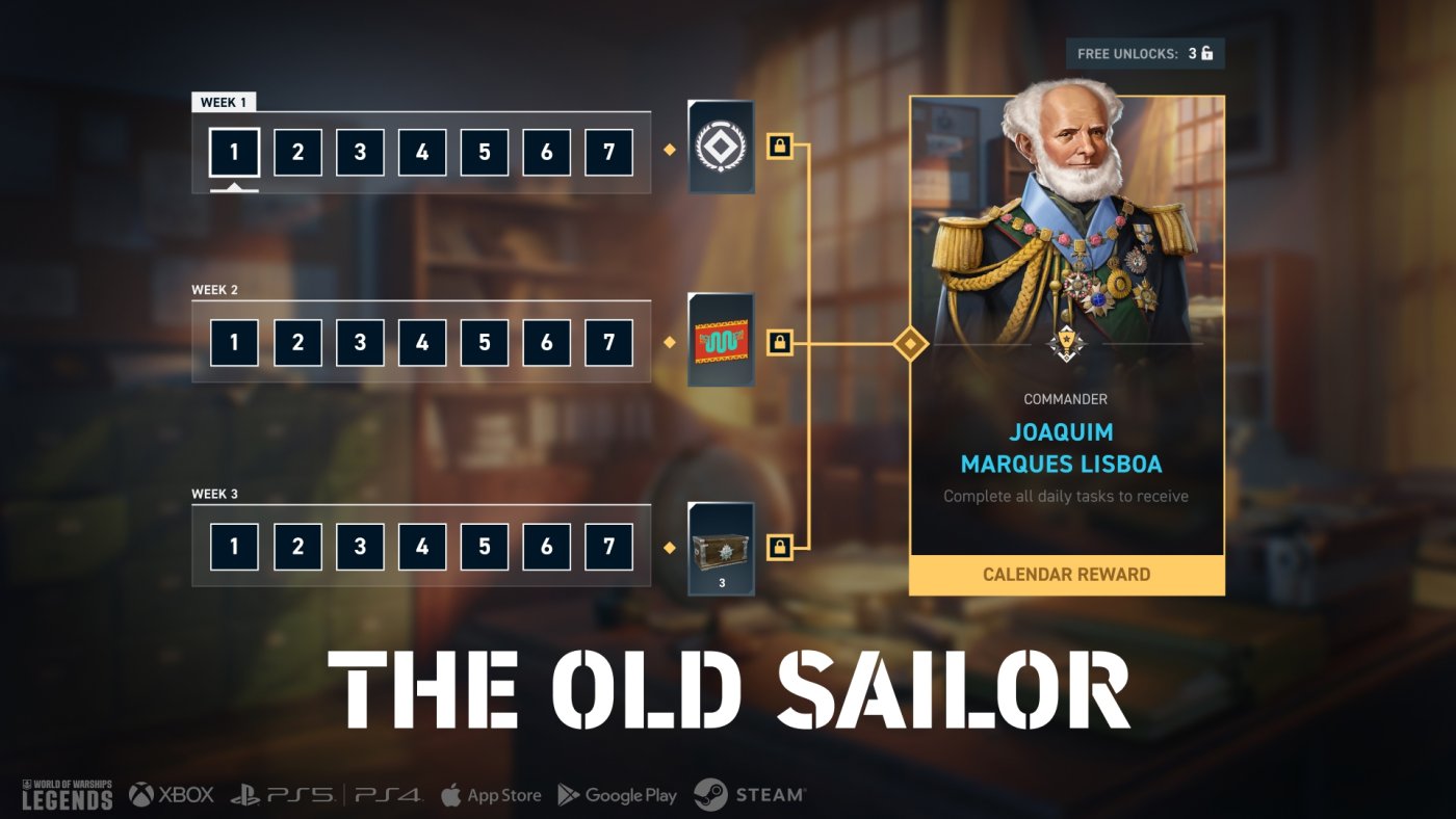 "The Old Sailor" Calendar starts on March 30! Complete all the daily tasks within 3 weeks to earn a ton of rewards, including Pan-American Cruiser crates and Ship Parts for the Kremlin marathon. The final reward is new Pan-American Commander Joaquim Marques Lisboa. Check out his unique features: