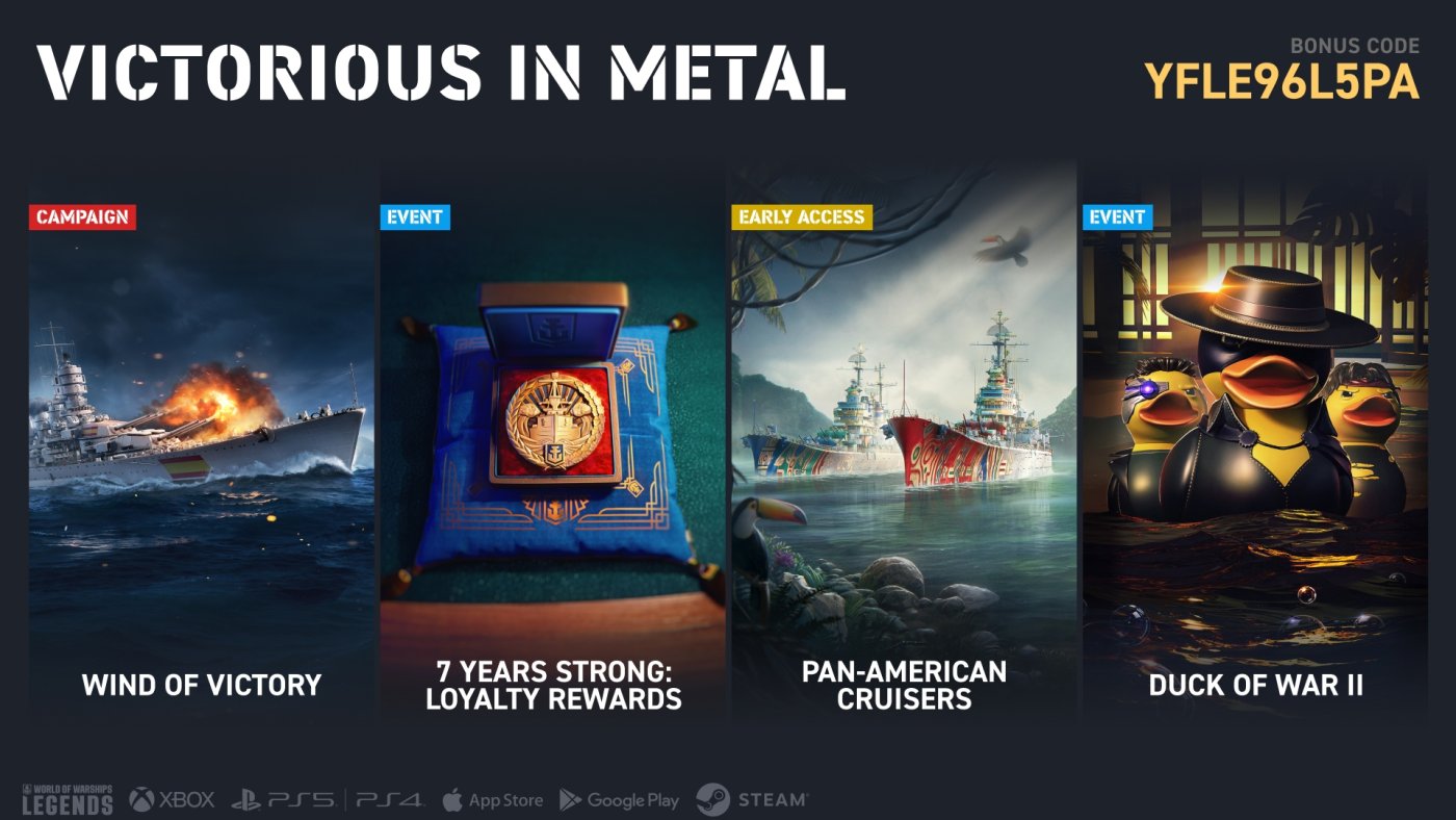 From March 30 to May 4, play the game and check our socials to receive secret bundles! Some are marked with a Golden Anchor in mission descriptions, while others unlock as a surprise after you complete certain in-game actions. You'll also find several Golden Anchors among the Wind of Victory campaign rewards—each unlocking one bundle. Check the Anniversary tab in the Store regularly to keep track of the bundles you receive! Some are completely free, while others can be obtained for credits or Global XP.