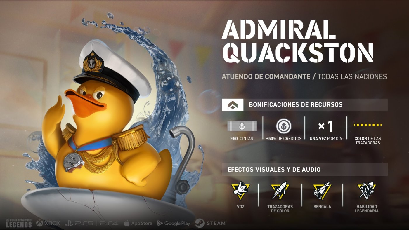 ¡Capitanes, un nuevo y alucinante modo de juego llega el 30 de marzo! Sumérjanse en 3 semanas de batallas salvajes de 6 contra 6 entre patitos de goma en un jacuzzi. ¡Dirijan a su bandada de goma hacia la victoria y obtengan recompensas únicas, incluyendo Patomuflajes, nuevos atuendos de Comandante y al épico acorazado Ducklinger!